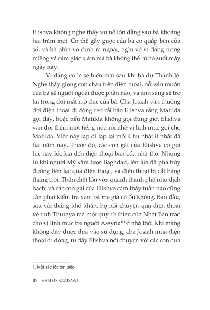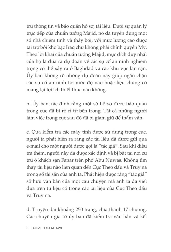 Cho đến nay, những gì ta biết về Iraq và cuộc chiến Iraq chủ yếu là từ nguồn phương Tây, lọc qua cách nhìn và nghĩ của phương Tây. Cuốn sách này cho ta cơ hội hiếm hoi để đắm mình vào đất nước và cuộc chiến đó thông qua trái tim và khối óc của một nhà văn tài hoa là con của xứ sở đó và đang sống ở thủ đô Baghdad, nơi mà hiện nay, nhiều năm sau chiến tranh, bom tiếp tục nổ, người tiếp tục chết vì bom, và có người, như Ahmed Saadawi, tiếp tục viết văn, mổ xẻ cái số phận chẳng giống ai của đất nước mình. Baghdad, nơi văn chương tồn tại để khôi phục sự hữu lý sát cạnh cái chết vô lý nhất, và nơi có những người như Ahmed Saadawi, viết văn để sự tồn tại của bản thân mình có một ý nghĩa: một hành trình phản kháng sự vô nghĩa.