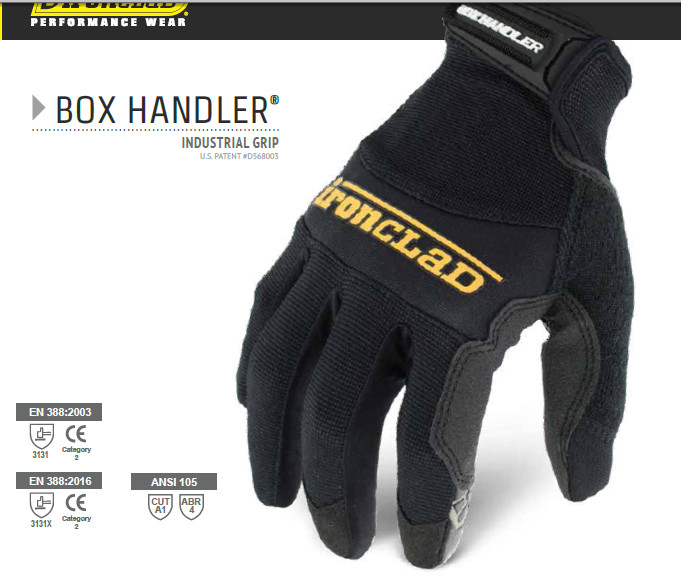 - Găng tay “Box Handler” là sản phẩm yêu thích của các chuyên gia vận chuyển gói hàng trên toàn thế giới, găng tay công nghiệp này có lòng bàn tay kết hợp silicone Diamondclad đã được cấp bằng sáng chế của Hãng Ironclad có độ bám tối đa.