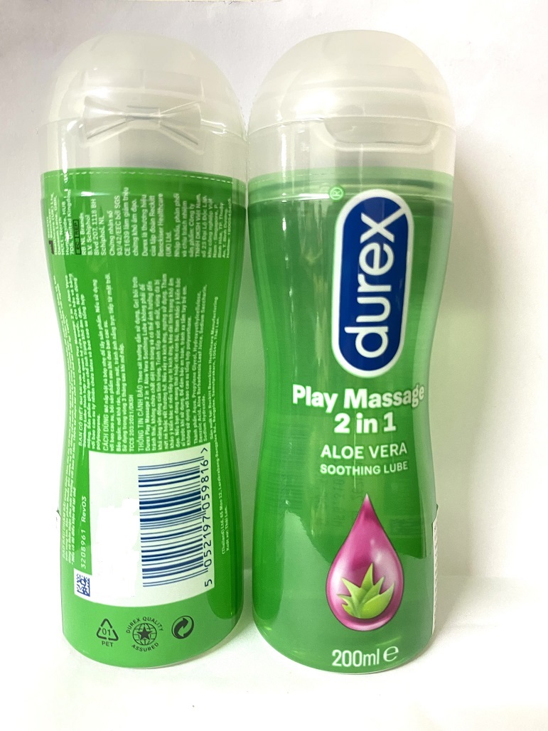 Gel bôi trơn Durex Play Massage 2in1 (200ml) Thành phần: Aqua, Propylene Glycol, Hydroxyethyl Cellulose, Benzoic Acid, Aloe Barbadensis Leaf Juice, Sodium Saccharin, Sodium Hydroxide. Công dụng: Bôi trơn và làm tăng độ ẩm tự nhiên
