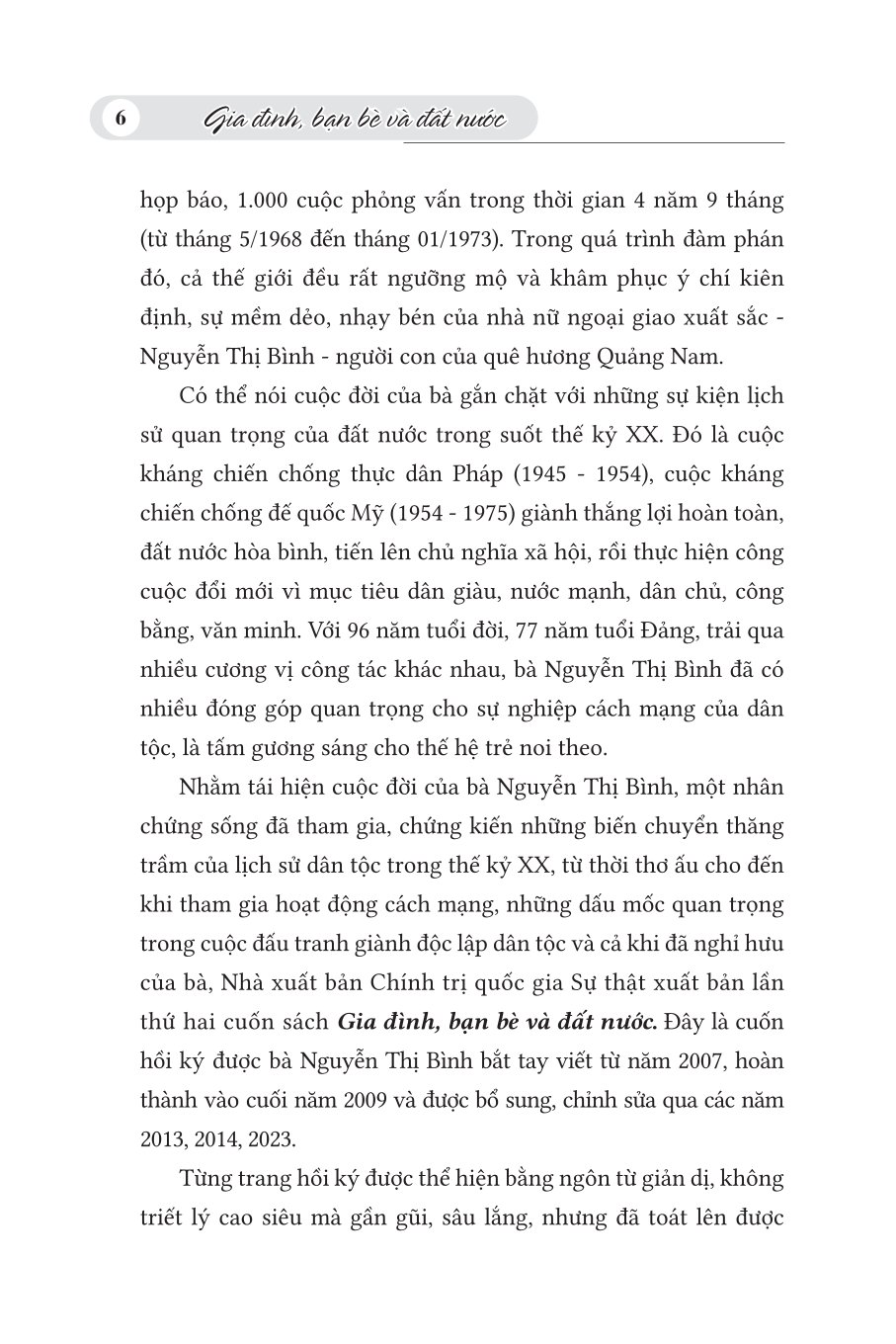 Bằng ngôn từ giản dị, gần gũi, sâu lắng mà toát lên được tinh thần yêu nước và ý thức trách nhiệm, tấm lòng vì nước vì dân trong từng câu chữ, qua những trang sách Gia đình, bạn bè và đất nước, bà Nguyễn Thị Bình - nhân chứng đã tham gia, chứng kiến những biến chuyển thăng trầm của lịch sử dân tộc trong thế kỷ 20 - nhìn lại cuộc đời gắn liền với vận mệnh đất nước của mình.
