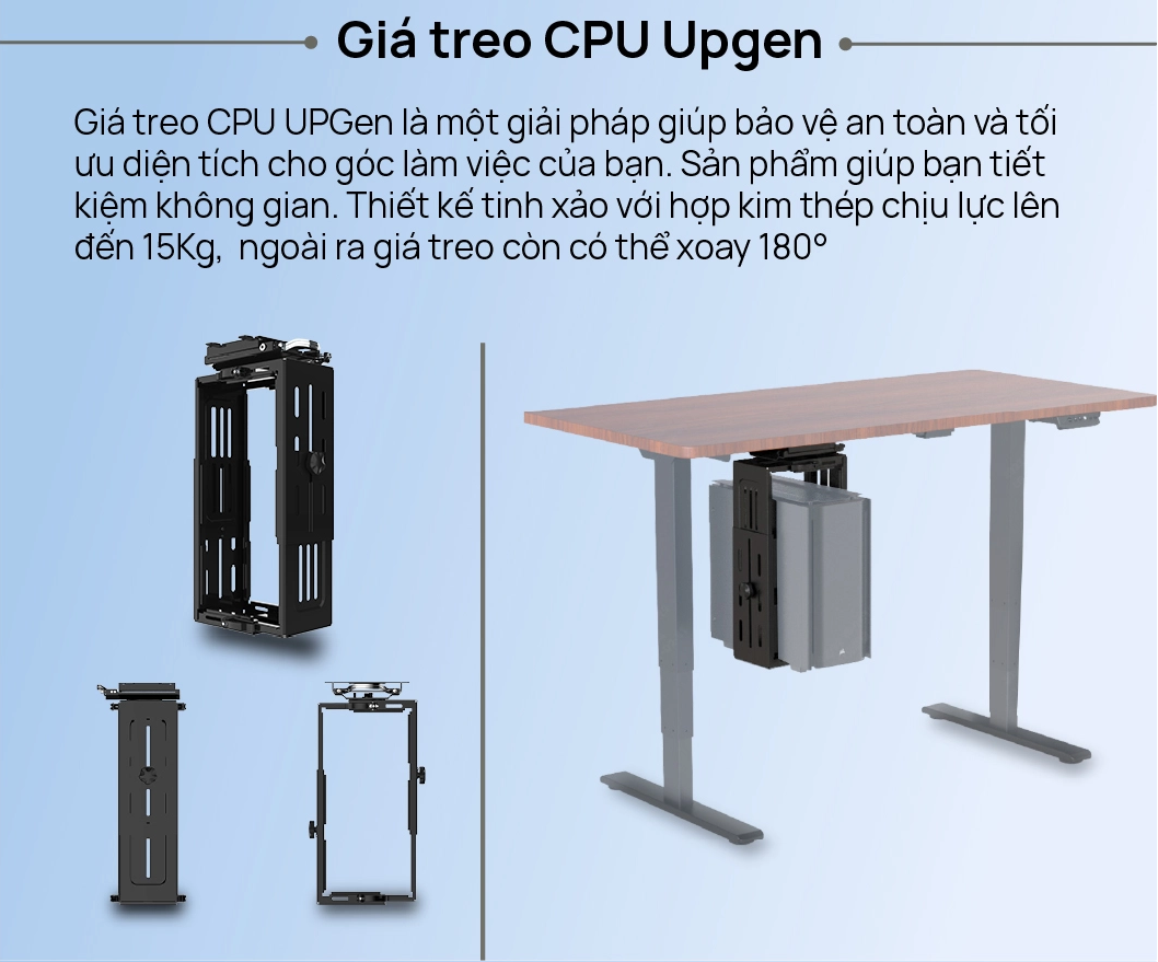 Giá treo Case Computers UPGEN giúp bảo vệ an toàn cho CPU của Bạn. Gắn CPU ngay dưới bàn làm việc, giữ cho CPU không bị thiệt hại do tai nạn tràn hoặc bị lật.