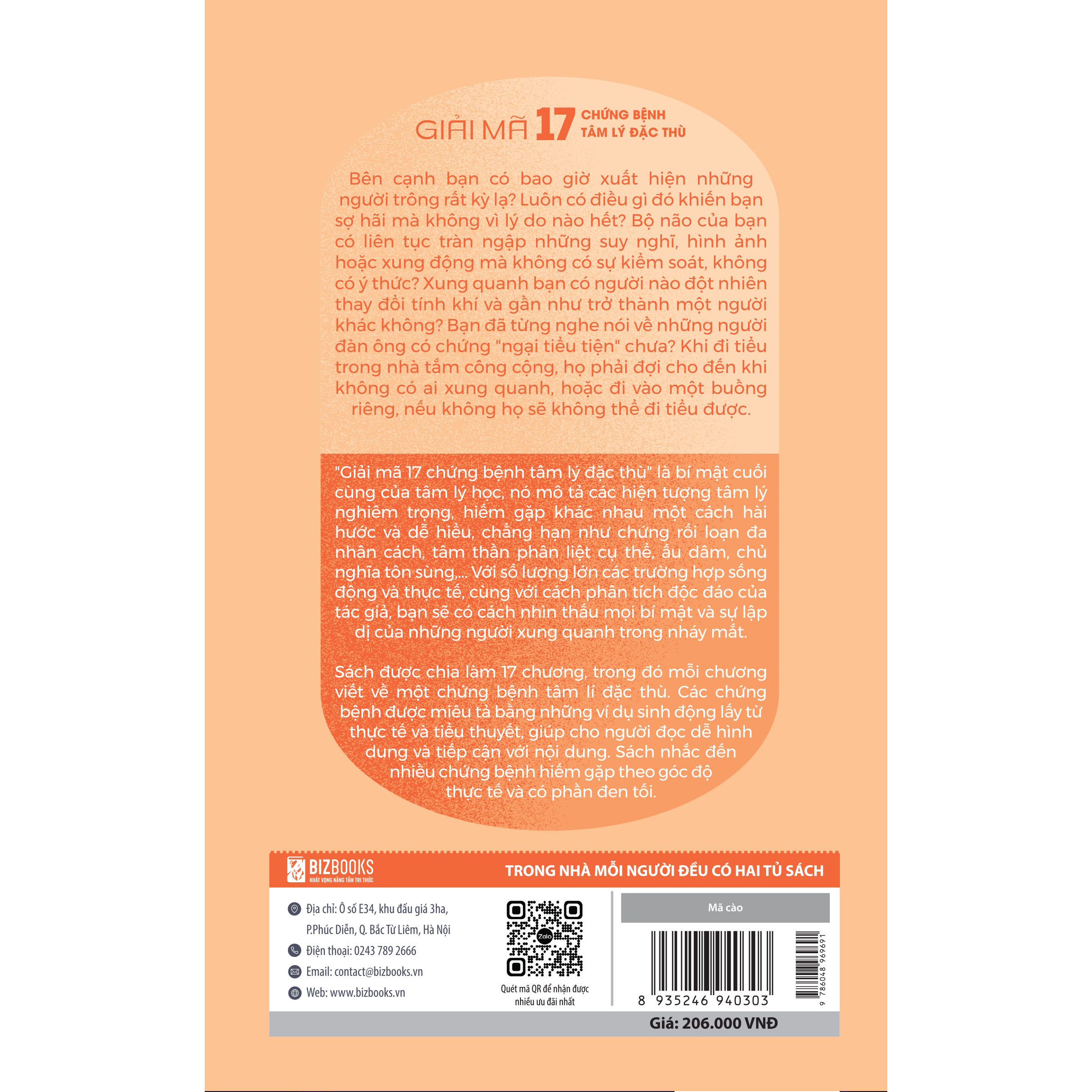 17 chương trong cuốn sách Giải mã 17 chứng bệnh tâm lý đặc thù đều được miêu tả bằng những ví dụ sinh động lấy từ thực tế để người đọc dễ hình dung hơn. Hãy đọc cuốn sách này để khám phá những bí mật đằng sau các hành vi kỳ quặc hoặc hiểu rõ hơn về tâm lý con người.