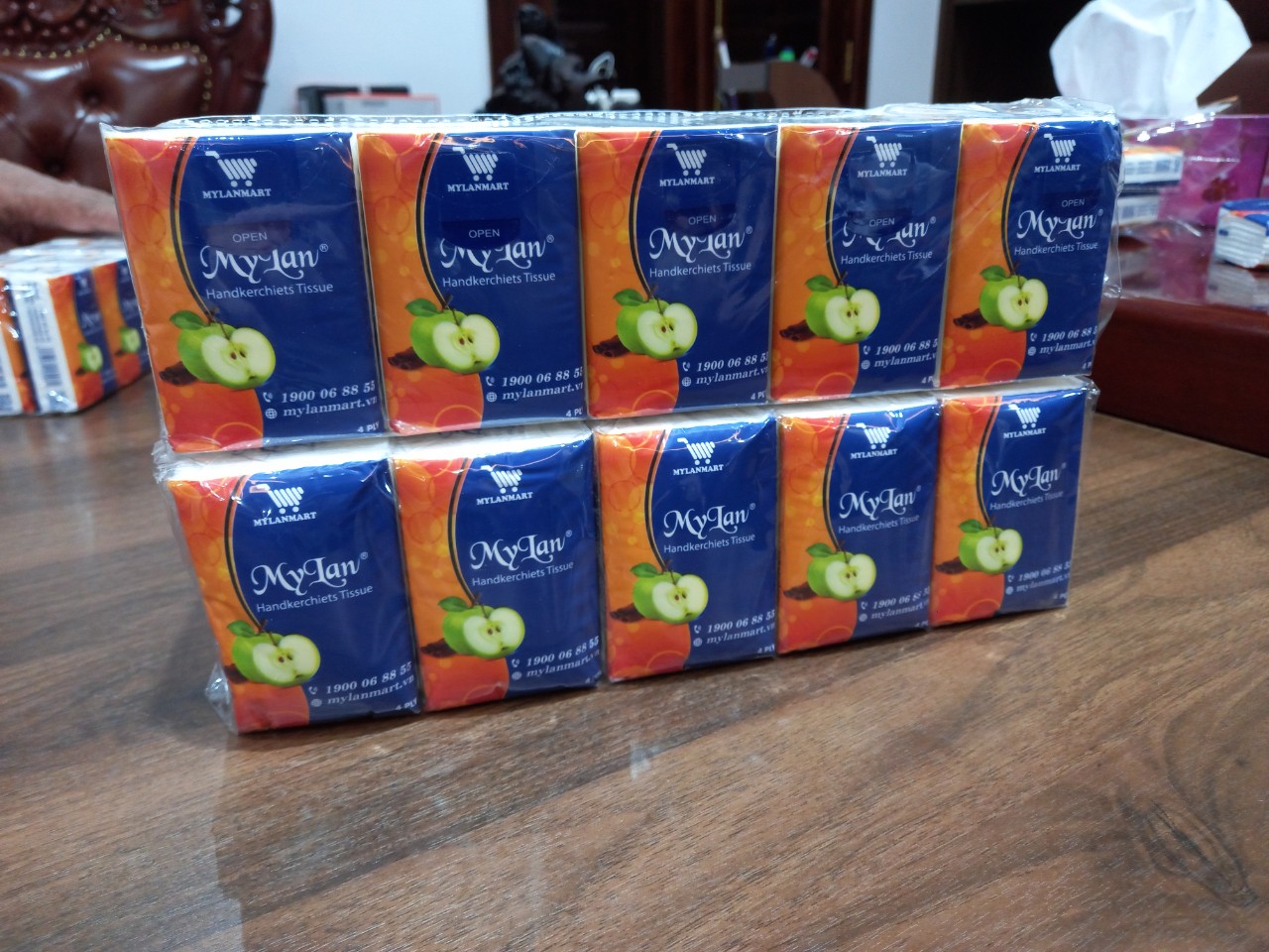 GIẤY BỎ TÚI QUẢ TÁO 4 LỚP (8 TỜ/GÓI, 15 GÓI/CÂY) Mylan - the Rubee ĐÁNH BAY KHÓ CHỊU KHI BỊ DỊ ỨNG THỜI TIẾT GIAO MÙA, thời tiết thất thường luôn là kẻ thù của những ai bị dị ứng, viêm xoang bởi chứng ngứa mũi, chảy nước mũi, hắt hơi liên tục… DÙNG KHĂN MÙI XOA VẢI, dùng đi dùng lại nhiều lần nguy cơ rước thêm họa vào thân vì vi khuẩn tiềm ẩn, giấy ở nhà vệ sinh công cộng không đảm bảo chất lượng, do giấy có nhiều tạp chất vi khuẩn có hại… KHĂN GIẤY BỎ TÚI MYLAN TÁO là sản phẩm cao cấp của công ty giấy Mylan luôn nói không với hóa chất OBA, không tái chế, không tẩy trắng chính là chân ái, ""VẬT BẤT LY THÂN"" dành cho mọi người mỗi khi ra ngoài, giúp đánh bay mọi khó chịu khi bị dị ứng thời tiết, viêm xoang và cả những vết bụi bẩn bám trên da. THIẾT KẾ SANG TRỌNG: Bao bì tinh tế, nhỏ gọn, nắp đóng mở OPEN luôn đảm bảo chất lượng giấy còn lại bên trong sau mỗi lần sử dụng. SIÊU TIỆN LỢI: Có thể mang theo mọi lúc, mọi nơi như đi tàu xe, đi máy bay hay vận động ngoài trời để sử dụng một lần như chiếc khăn mùi xoa, mà không để lại vụn giấy trên da và có thể dùng thay thế bông tẩy trang hàng ngày cho chi em. KẾT CẤU 4 LỚP ĐỈNH CỦA CHÓP: Dày dặn, độ dai x2 lần, bề mặt giấy được dập nổi vân hoa 3D hình khăn mùi xoa mềm mại tựa lông vũ. NGUYÊN LIỆU bột ghỗ thông có Độ trắng 86% tự nhiên Không sử dụng hóa chất tẩy trắng. TRÊN CẢ SỰ AN TOÀN: Giấy được sản xuất trên dây chuyền tiên tiến. Kiểm soát chất lượng nghiêm ngặt theo tiêu chuẩn ISO: 9001-2015. Tích hợp công nghệ kháng khuẩn và chống nấm mốc tiên tiến, sấy ở nhiệt độ cao tới 300 độ C và khử trùng bằng tia cực tím nên an toàn với cả những vùng da nhạy cảm nhất. MÙI HƯƠNG TÁO TỰ NHIÊN: Thanh mát nhẹ nhàng, đem lại cảm giác thư thái cho người dùng. SIÊU TIẾT KIỆM: Chỉ cần 1 tờ đã đủ cho mỗi lần dùng, giúp tiết kiệm tiền chi phí mua giấy x3 lần. Sản xuất tại: Công ty TNHH giấy MyLan Chỉ 39k 1 xách 15 gói