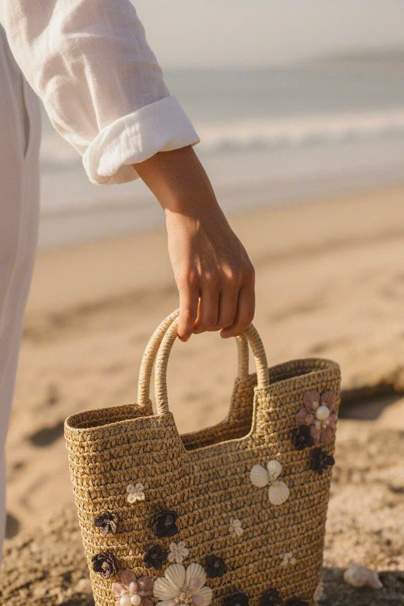 - Chất liệu giỏ: cói giấy, canvas - Chất liệu trang trí: vỏ sò, ốc đã qua xử lý chống ẩm mốc - Nghệ nhân trang trí: Minh Thu Từ mạch đất Mẹ, sự sống