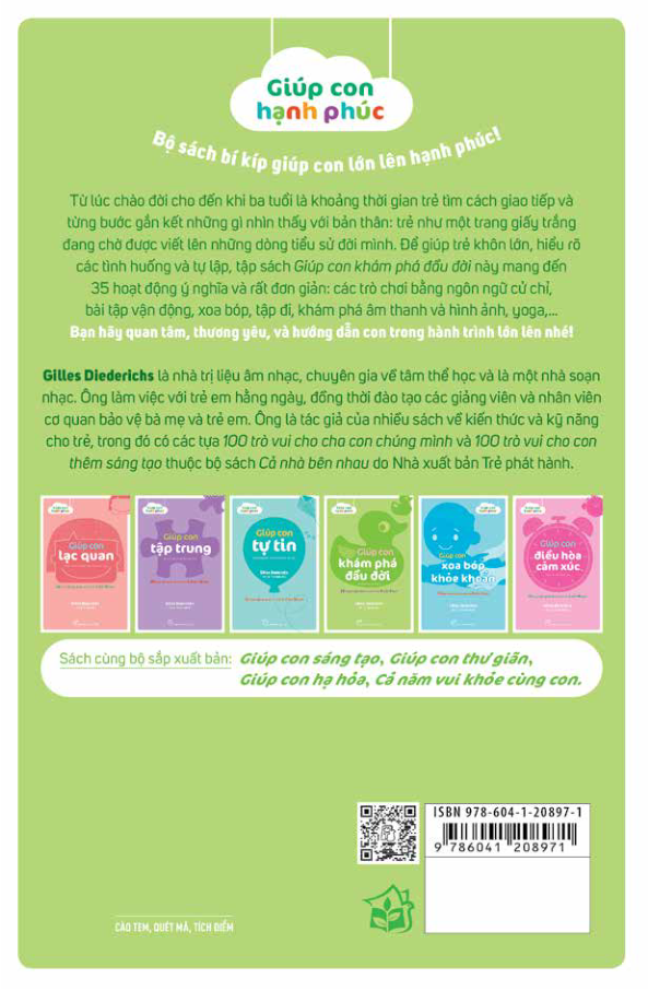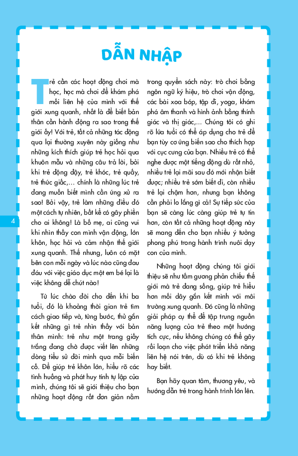 Từ lúc chào đời cho đến khi ba tuổi, đó là khoảng thời gian trẻ tìm cách giao tiếp và, từng bước, thử gắn kết những gì trẻ nhìn thấy với bản thân mình: trẻ như một tờ giấy trắng, trên đó sẽ viết lên những dòng tiểu sử đời mình qua mỗi biến cố. Để giúp trẻ khôn lớn, hiểu rõ các tình huống và tự lập, tập sách này mang đến 35 hoạt động ý nghĩa và rất đơn giản: các trò chơi bằng ngôn ngữ cử chỉ, các bài tập vận động, mát-xa, tập đi, khám phá âm thanh và hình ảnh, yoga,… Mỗi hoạt động đều ghi chú về lứa tuổi cụ thể để cha mẹ có thể lựa chọn phù hợp cho con.