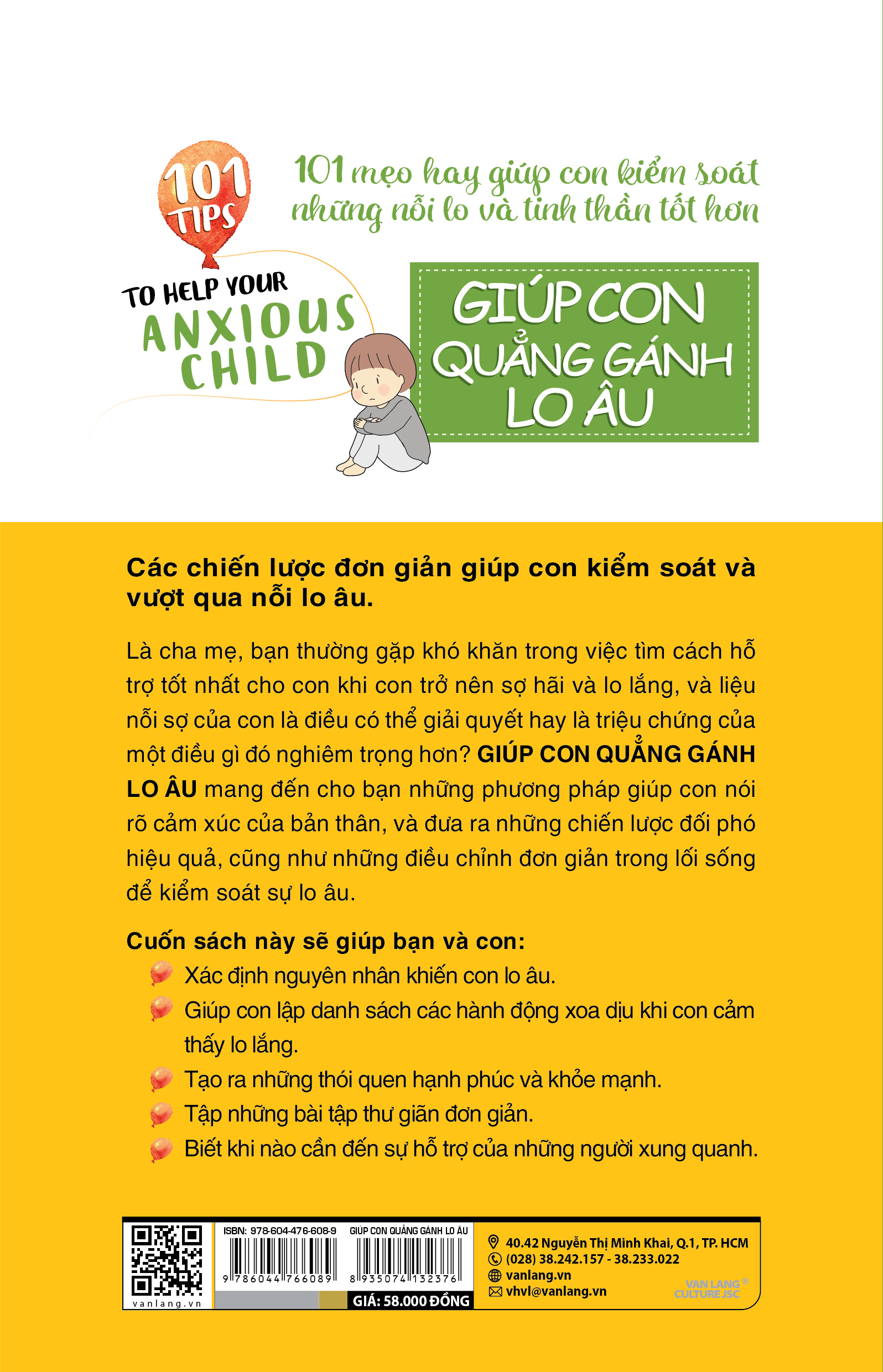Là cha mẹ, bạn thường gặp khó khăn trong việc tìm cách hỗ trợ tốt nhất cho con khi con trở nên sợ hãi và lo lắng, và liệu nỗi sợ của con là điều có thể giải quyết hay là triệu chứng của một điều gì đó nghiêm trọng hơn? GIÚP CON QUẲNG GÁNH LO ÂU mang đến cho bạn những phương pháp giúp con nói rõ cảm xúc của bản thân, và đưa ra những chiến lược đối phó hiệu quả, cũng như những điều chỉnh đơn giản trong lối sống để kiểm soát sự lo âu.