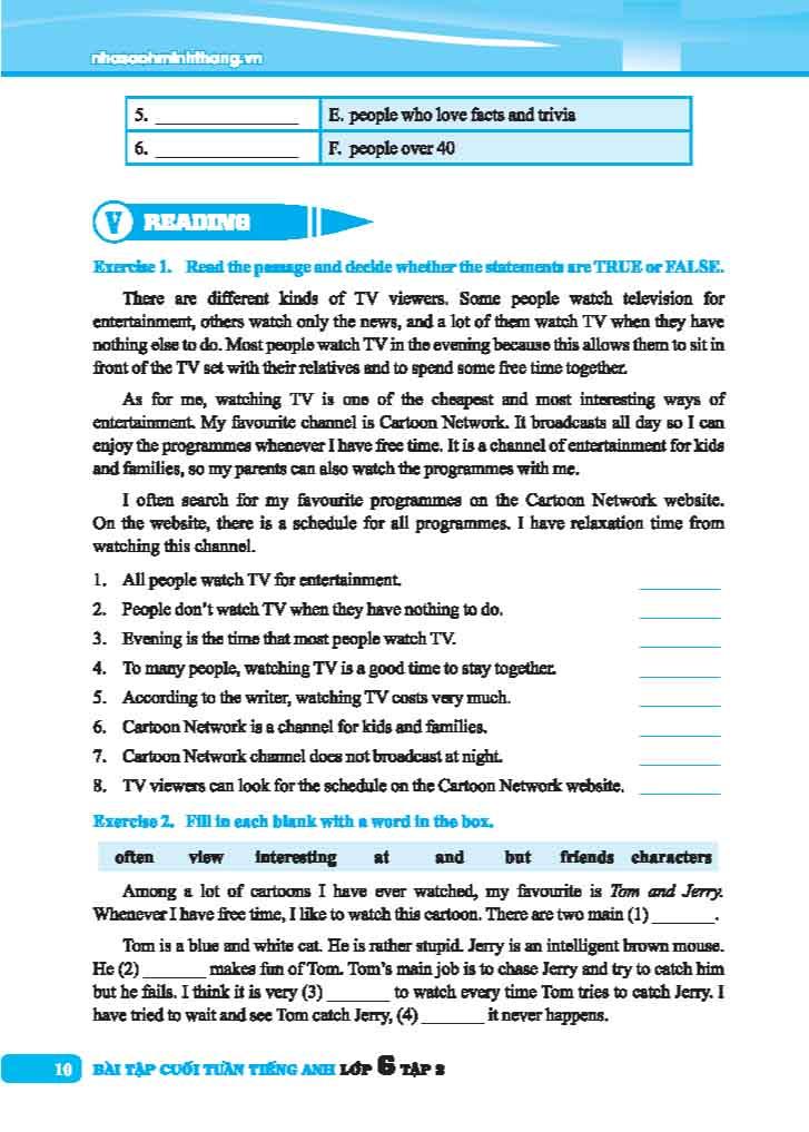 - Phần bài tập nâng cao: được thiết kế để đánh thức và phát triển kỹ năng tiếng Anh nâng cao của các em. Những bài tập ở phần này tập trung vào việc mở rộng vốn từ vựng, phát triển mạnh kiến thức ngữ pháp, rèn luyện kĩ năng đọc hiểu sâu và kĩ năng viết sáng tạo. Các em sẽ được khuyến khích tư duy linh hoạt và sáng tạo thông qua các hoạt động và bài tập đa dạng. Chúng tôi tin rằng cuốn sách Bài Tập Cuối Tuần Tiếng Anh sẽ là nguồn cung cấp bài tập một cách đa dạng và sâu sắc cho các em có ý định mài giũa các kiến thức ngữ pháp, từ vựng, ngữ âm và các kĩ năng nghe - nói - đọc - viết của m.ình