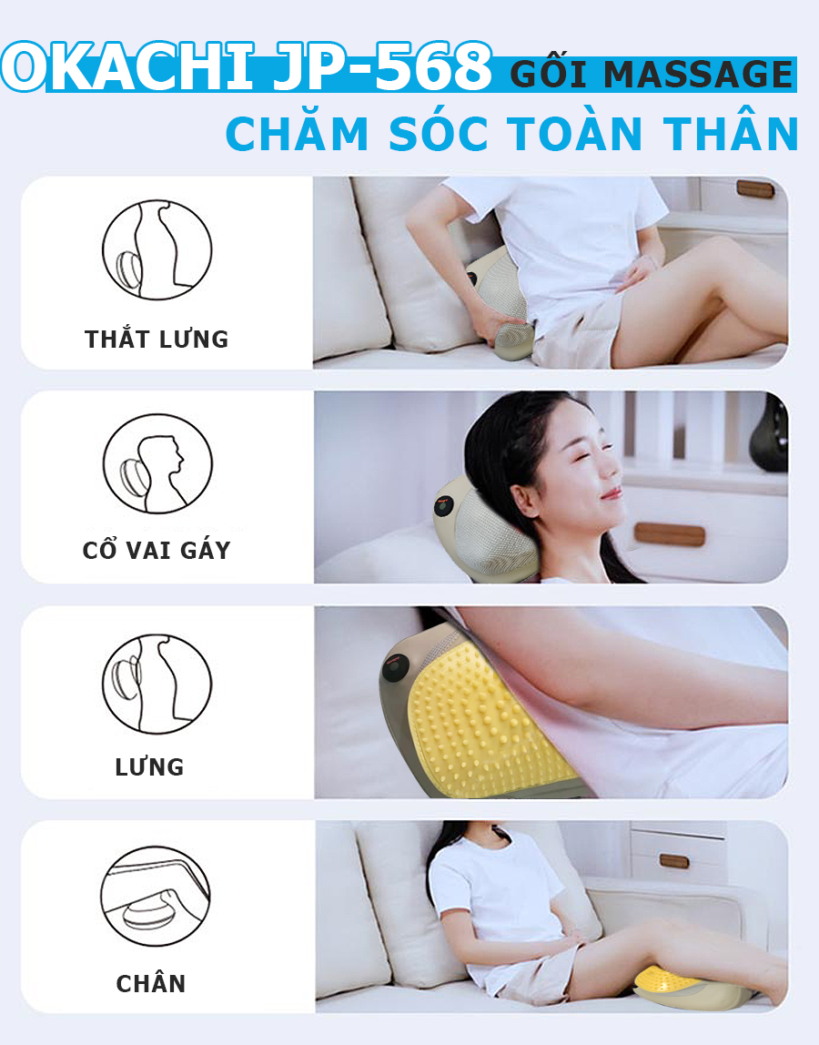 Đau mỏi cổ vai gáy mang đến cảm giác cực kỳ khó chịu cho con người, triệu chứng này thường gặp ở người cao tuổi, nhân viên văn phòng, ngủ sai tư thế… Tình trạng này kéo dài sẽ ảnh hưởng lớn đến công việc và sinh hoạt, chính vì thế bạn cần sở hữu ngay Gối massage hồng ngoại đau vai cổ lưng Shiatsu OKACHI JP-568 để nhanh chóng thoát khỏi triệu chứng trên và bảo vệ cho sức khỏe. Sản phẩm này sau khi có mặt tại thị trường Việt Nam đã được đông đảo người tiêu dùng đón nhận và yêu thích.