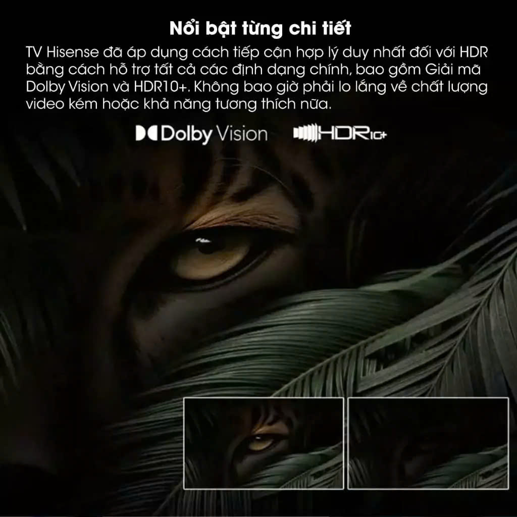 - Tivi Hisense sử dụng công nghệ HDR10+ và Dolby Vision để cung cấp hình ảnh với chất lượng "chuẩn rạp chiếu" với độ sáng vượt trội, hình ảnh sắc nét.