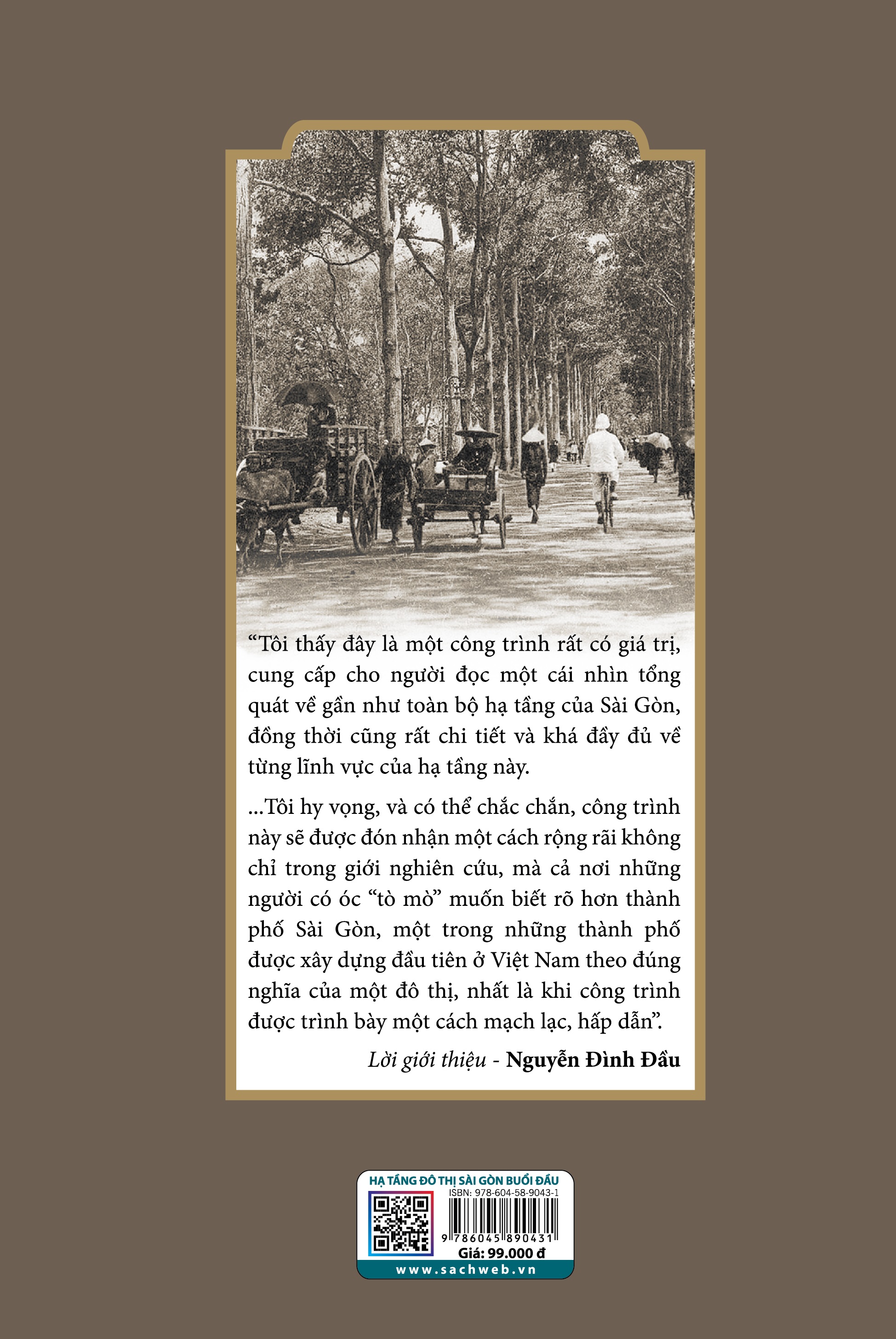 Công ty phát hành: NXB Tổng Hợp TPHCM Nhà xuất bản: NXB Tổng Hợp TP.HCM Tác giả: Trần Hữu Quang Loại bìa: Bìa Mềm Số trang: 251 Năm xuất bản: 2023 Hạ Tầng Đô Thị Sài Gòn Buổi Đầu Đây là một quyển sách cung cấp nhiều tư liệu lịch sử lý thú về mặt cơ sở hạ tầng đô thị của thành phố Sài Gòn thuở xưa, bổ ích và cần thiết cho giới kinh doanh du lịch ở TP.HCM. Sau đây là vài thí dụ minh họa trích từ quyển sách này. Việc thắp sáng đường phố Sài Gòn lần đầu tiên được thực hiện vào năm 1867 ở một vài đường phố trung tâm (quận 1 ngày nay) bằng hệ thống cột đèn lồng cách nhau 100 mét, thắp bằng dầu dừa, năm 1870 chuyển sang thắp bằng dầu lửa (tức dầu hỏa), và kể từ năm 1897 mới bắt đầu sử dụng đèn điện để thắp sáng đường phố. Nhà máy điện đầu tiên của Sài Gòn được xây dựng xong vào năm 1897, nằm gần đường Hai Bà Trưng (nay là trụ sở Tổng công ty Điện lực miền Nam), sau Hải Phòng là nơi đầu tiên ở Đông Dương có nhà máy điện (1892)