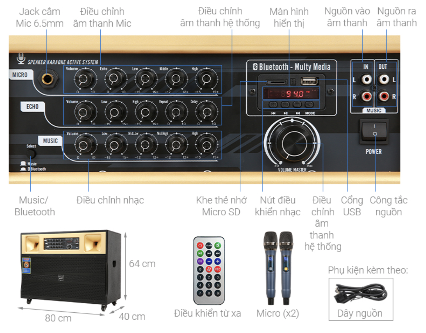 _Nguồn AC + DC _Hỗ trợ USB SD CARD Bluetooth Jack 3.5 _Phụ kiện 2 mic cầm tay không dây, adapter. remote _Công suất: 80Watts