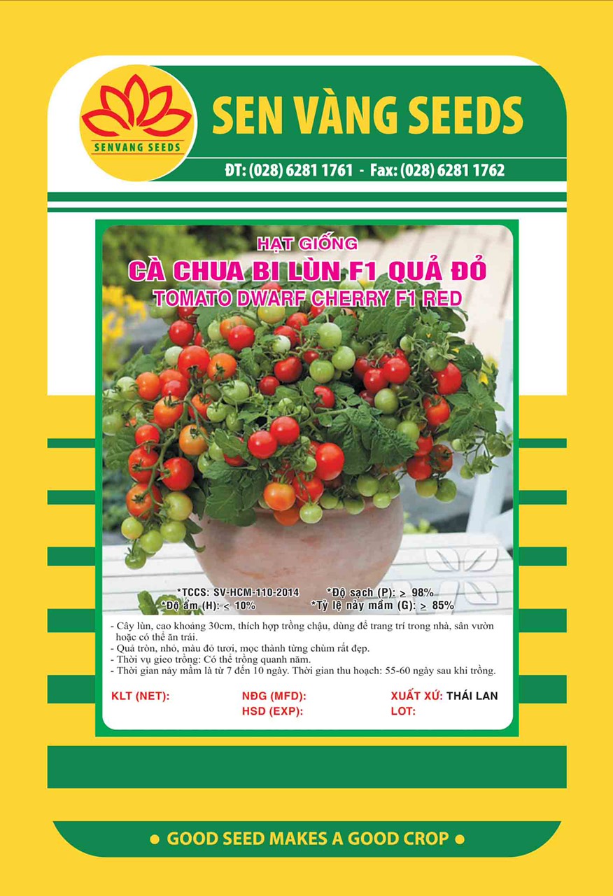 - Đặc tính giống: Cà chua Bi Lùn Đỏ F1 - cây phát triển vô hạn, sinh trưởng phát triển khỏe, kháng bệnh tốt. Thân lùn cao 30cm, thích hợp trồng trong chậu trang trí trong nhà hoặc trong vườn. Trái hình tròn, thịt dày và ngọt, chín màu đỏ rất đẹp. Trái nặng 15-16g