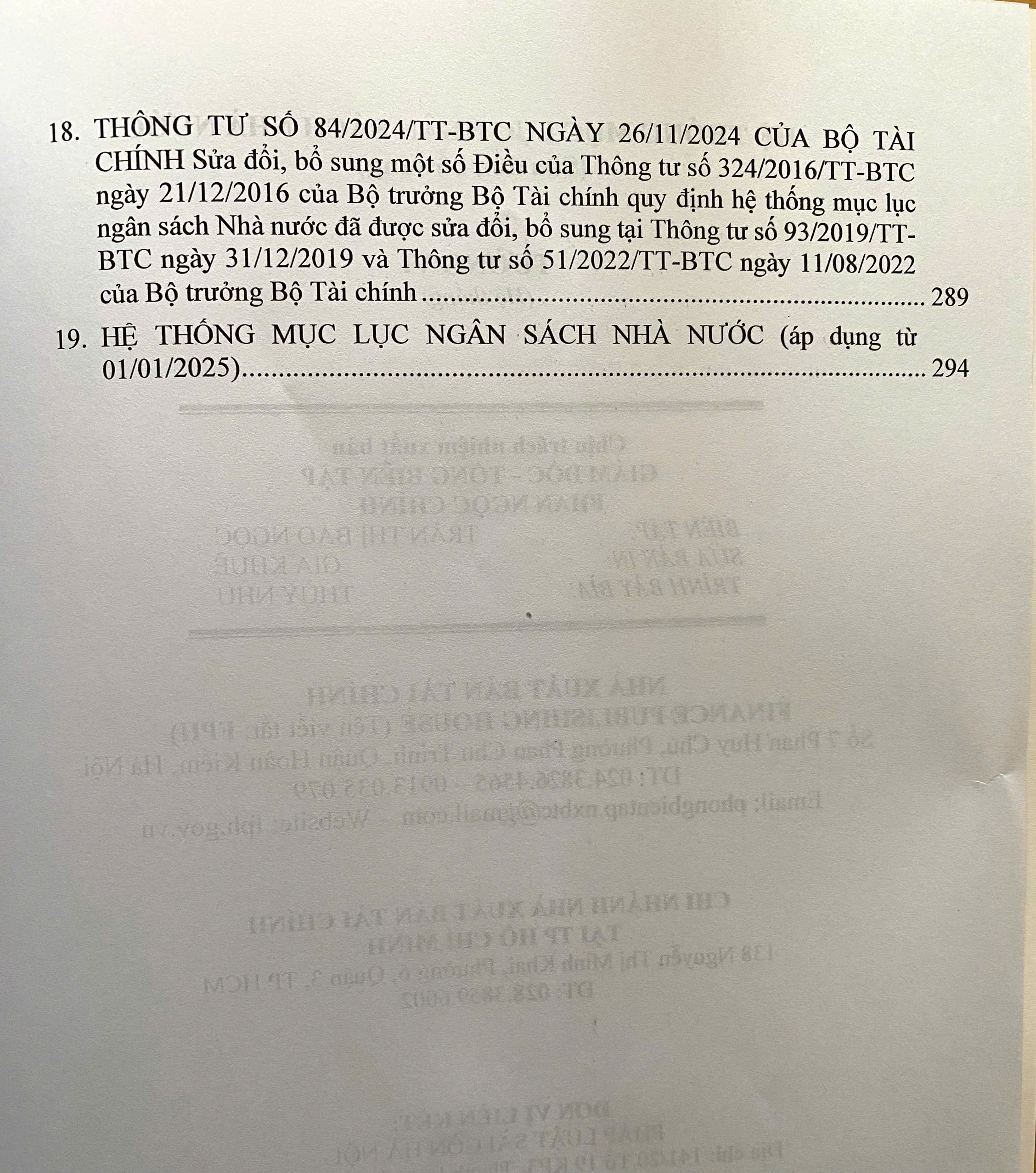 Ngày 26/11/2024, Bộ Tài chính ban hành Thông tư 84/2024/TT-BTC sửa đổi, bổ sung một số điều của Thông tư 324/2016/TT-BTC ngày 21/12/2016 quy định hệ thống mục lục ngân sách Nhà nước đã được sửa đổi, bổ sung tại Thông tư 93/2019/TT-BTC ngày 31/12/2019 và Thông tư 51/2022/TT-BTC ngày 11/08/2022. Mục tiêu chính của việc sửa đối này là cải thiện tính linh hoạt, hiệu quả và phù hợp hơn với các yêu cầu quản lý ngân sách nhà nước trong bối cảnh mới. Một số mã mục, tiểu mục được thay đổi để phù hợp với thực tiễn thu chi ngân sách hiện tại. Ngoài ra, các điều chỉnh nhằm đảm bảo phản ánh đầy đủ và rõ ràng hơn nguồn gốc cũng như mục đích sử dụng ngân sách. Nhằm giúp các cơ quan, đơn vị nắm bắt kịp thời và thực hiện tốt việc quản lý tài chính, lập dự toán, thanh quyết toán thu chi ngân sách nhà nước Nhà xuất bản Tài Chính xuất bản và phát hành cuốn sách: HỆ THỐNG MỤC LỤC NGÂN SÁCH NHÀ NƯỚC (Sửa đổi, bổ sung) Nội dung cuốn sách gồm các phần chính sau: Phần thứ nhất. HƯỚNG DẪN XÂY DỰNG DỰ TOÁN NGÂN SÁCH NHÀ NƯỚC NĂM 2025 VÀ KẾ HOẠCH TÀI CHÍNH - NGÂN SÁCH NHÀ NƯỚC 03 NĂM 2025 - 2027. Phần thứ hai. HƯỚNG DẪN THỰC HIỆN CHẾ ĐỘ QUẢN LÝ, TÍNH HAO MÒN TÀI SẢN CỐ ĐỊNH. Phần thứ ba. QUY ĐỊNH VIỆC LẬP DỰ TOÁN, QUẢN LÝ SỬ DỤNG VÀ QUYẾT TOÁN KINH PHÍ NGÂN SÁCH NHÀ NƯỚC. Phần thứ tư. HỆ THỐNG MỤC LỤC NGÂN SÁCH NHÀ NƯỚC ÁP DỤNG TỪ 01/01/2025 Luatvietbook xin trân trọng giới thiệu cuốn sách đến bạn đọc!