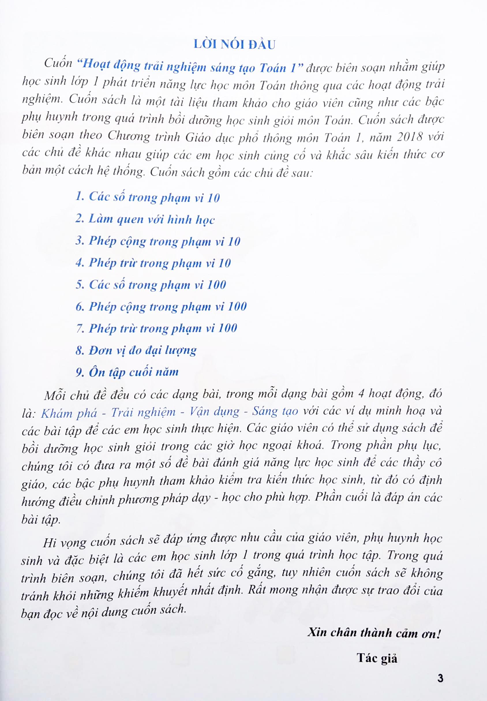 Được biên soạn nhằm giúp học sinh lớp 1 phát triển năng lực học môn Toán thông qua các hoạt động tral nghiệm. Cuốn sách là một tài liệu tham khảo cho giáo viên cũng như các bạc phụ huynh trong quá trình bồi dưỡng học sinh giỏi môn Toán. Cuốn sách được biên soạn theo Chương trình Giáo dục phổ thông môn Toán 1, năm 2018 với các chủ đề khác nhau giúp các em học sinh củng cố và khắc sâu kiến thức cơ bản một cách hệ thống. Cuốn sách gồm các chủ đề sau: