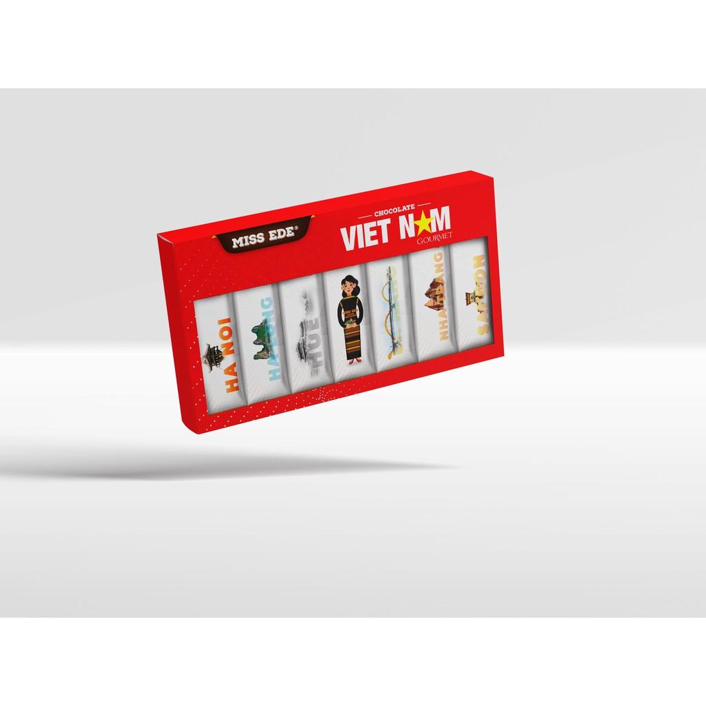 "BỘ HỘP QUÀ CHOCOLATE VIETNAM GOURMET: - Với 7 địa danh du lịch nổi tiếng của Việt Nam: Hà Nội, Hạ Long, Huế, Đà Nẵng, Buôn Ma Thuột, Nha Trang, Sài Gòn (TP HCM). Như