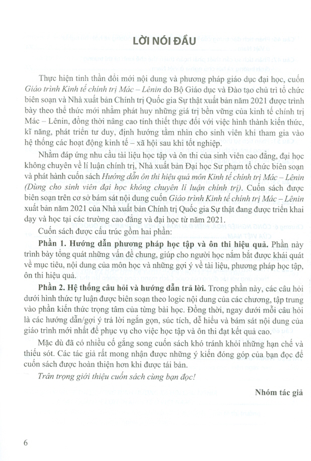 Nhằm đáp ứng nhu cầu tài liệu học tập và ôn thi của sinh viên cao đẳng, đại học không chuyên về lí luận chính trị, Nhà xuất bản Đại học Sư phạm tổ chức biên soạn và phát hành cuốn sách Hướng dẫn ôn thi hiệu quả môn Kinh tế chính trị Mác - Lênin (Dùng cho sinh viên đại học không chuyên lí luận chính trị). Cuốn sách được biên soạn trên cơ sở bám sát nội dung cuốn Giáo trình Kinh tế chính trị Mác - Lênin xuất bản năm 2021 của Nhà xuất bản Chính trị Quốc gia Sự thật đang được triển khai dạy và học tại các trường cao đẳng và đại học từ năm 2021.