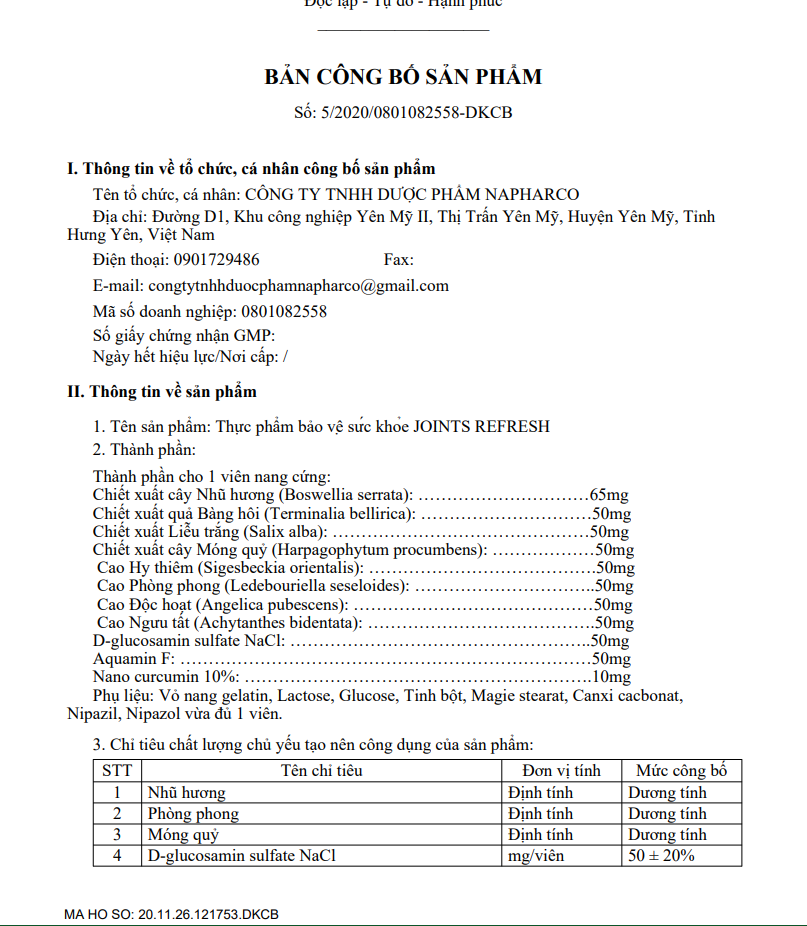Joint Refresh được sản xuất tại nhà máy Công Ty TNHH NAPHARCO đạt chuẩn GMP, có nhiều năm kinh nghiệm trong lĩnh vực nghiên cứu và sản xuất các dòng thực phẩm chức năng bảo vệ sức khoẻ.