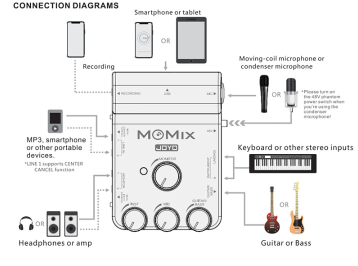 MOMIX phù hợp với nhạc cụ và giọng hát, kết nối tai nghe hoặc MOMIX có đầu ra để cắm Loa nghe trực tiếp