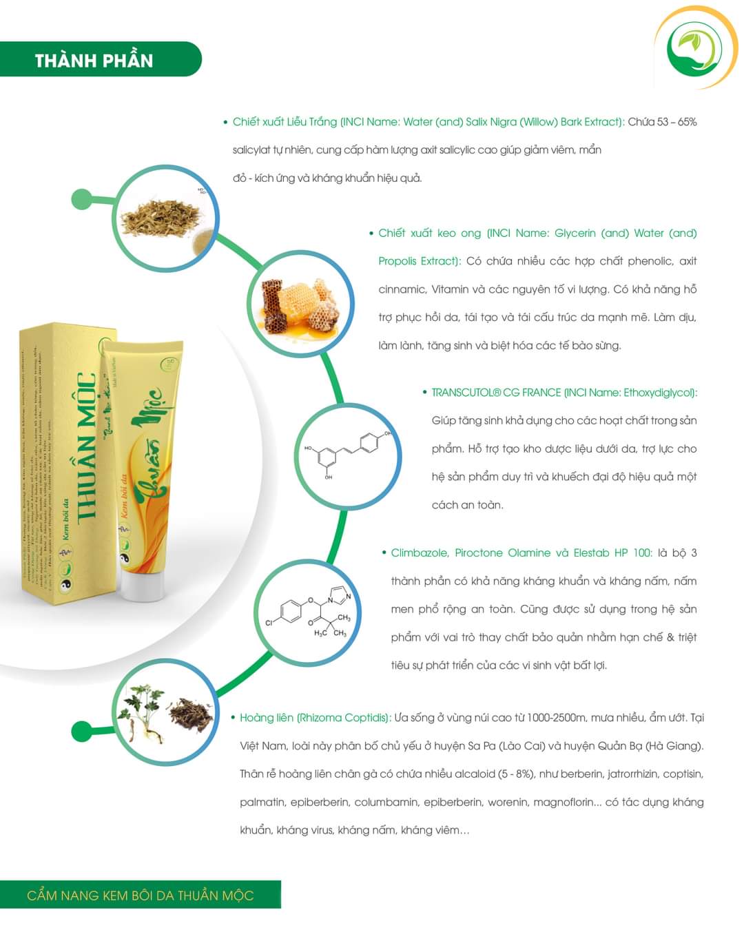 Combo kem bôi da thuần mộc ngừa rôm sảy chàm sữa nấm da đầu Thanh Mộc Hương 16g Thành Phần : Kem bôi da Thuần Mộc được bào chế hoàn toàn từ thảo dược thiên
