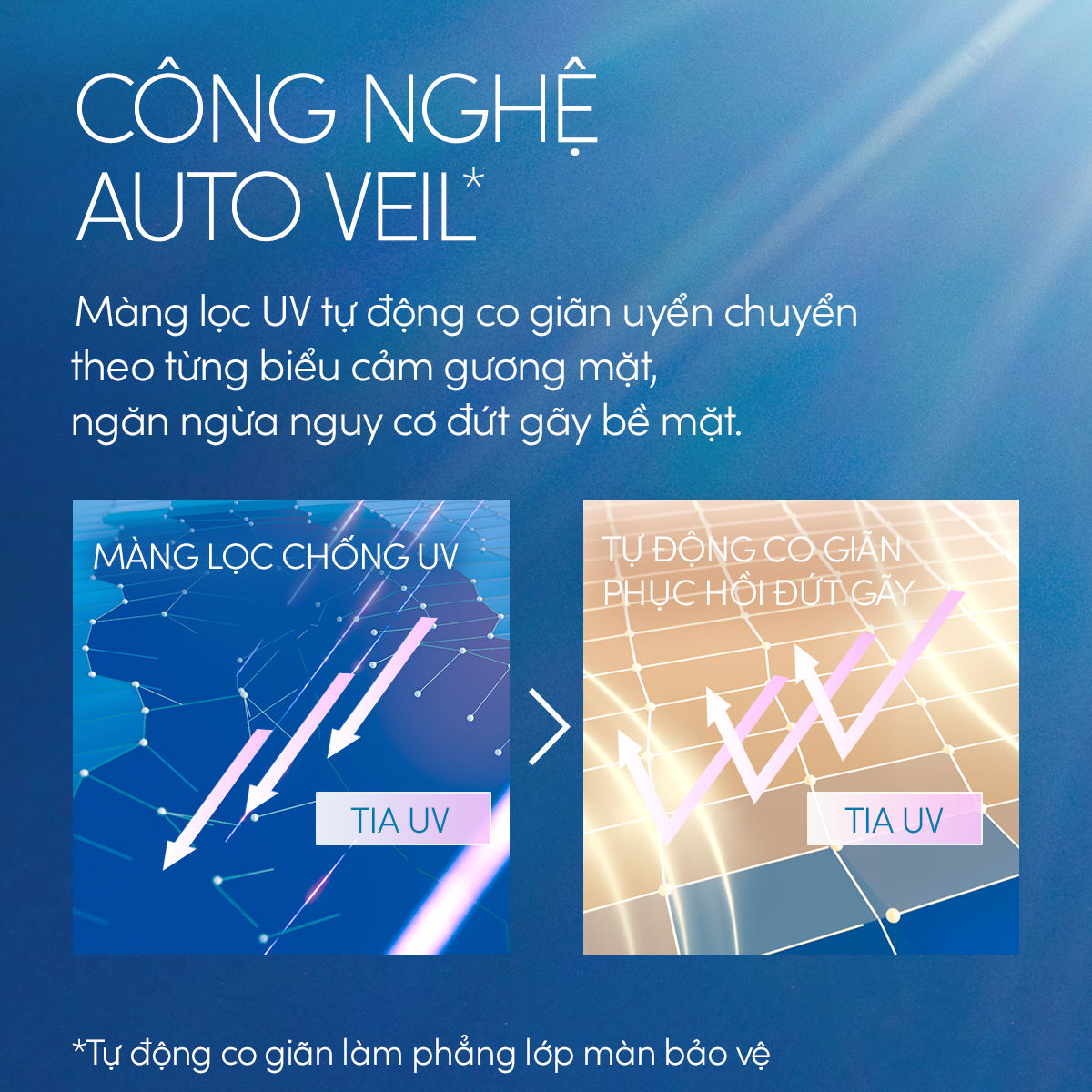 • Công nghệ độc quyền Auto Veil: Bảo vệ da trước mọi tác động nhờ chống đứt gãy màng lọc UV do chuyển động da của biểu cảm gương mặt.