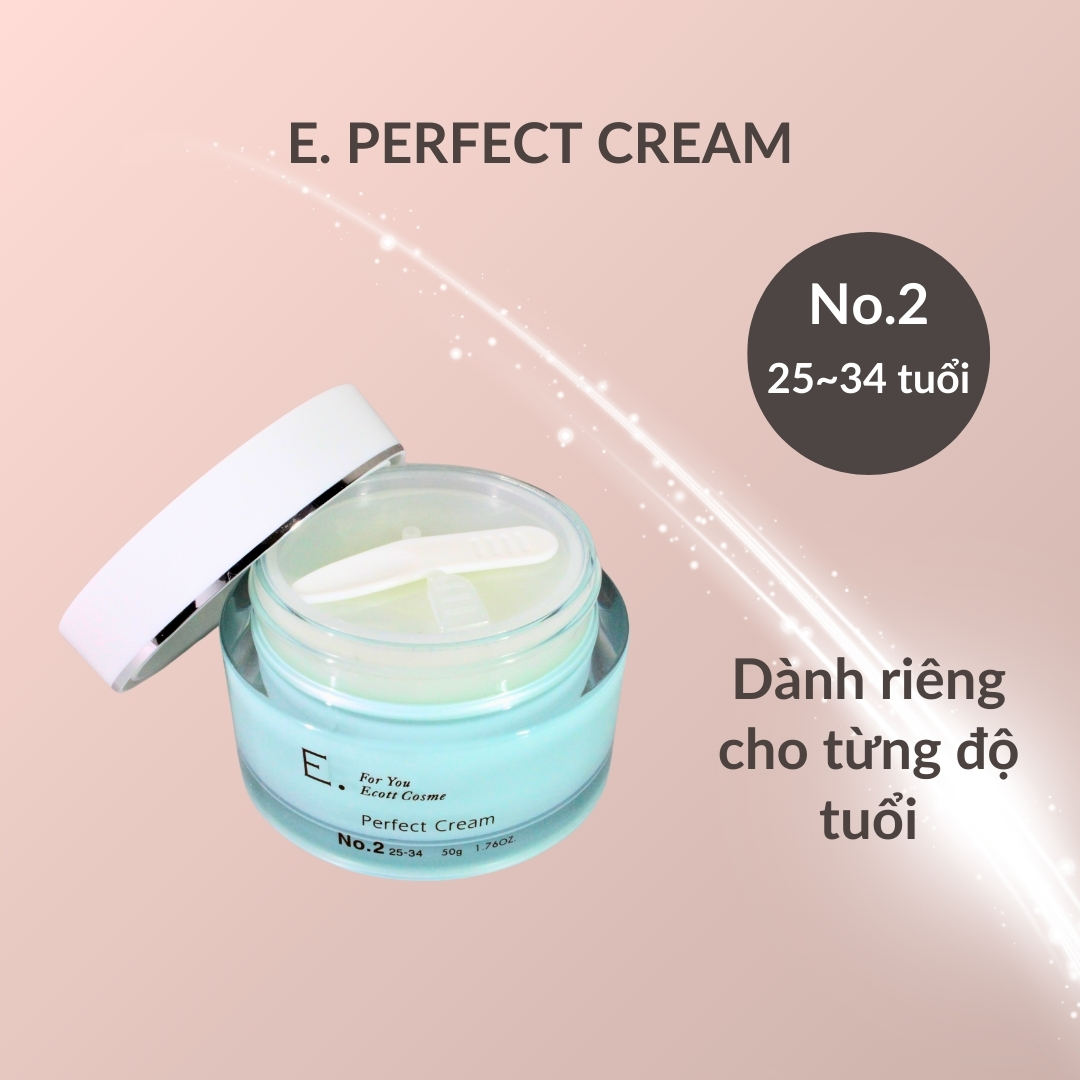 E. Perfect Cream 2 là kem dưỡng da Organic (All In One) của Nhật Bản, kem có dạng gel, 50g. Công dụng:  ★ Giữ ẩm và làm mềm da, giúp da mịn màng hơn.  ★ Chống lão hoá, phục hồi hàng rào bảo vệ tự nhiên của da.  ★ Se khít lỗ chân lông và làm da săn chắc. Sản phẩm đa chức năng bao gồm:  ① Nước hoa hồng (Lotion)  ② Tinh chất dưỡng da (Serum)  ③ Sữa dưỡng  ④ Kem dưỡng da  ⑤ Mặt nạ dưỡng da Sản phẩm này hướng đến nhóm độ tuổi từ 25~34, đây là độ tuổi da bắt đầu lão hóa, khả năng phục hồi của da giảm đi đáng kể. Để chống lại tình trạng da bị khô, lỗ chân lông to, mụn đầu đen. Sản phẩm này cung cấp độ ẩm và dưỡng chất cho da, mang đến cho bạn một làn da mềm mại, mịn màng. Giúp se khít lỗ chân lông, mang đến một làn da trẻ trung, tươi tắn. Ngoài ra nó còn giúp săn chắc da và cải thiện kết cấu da.