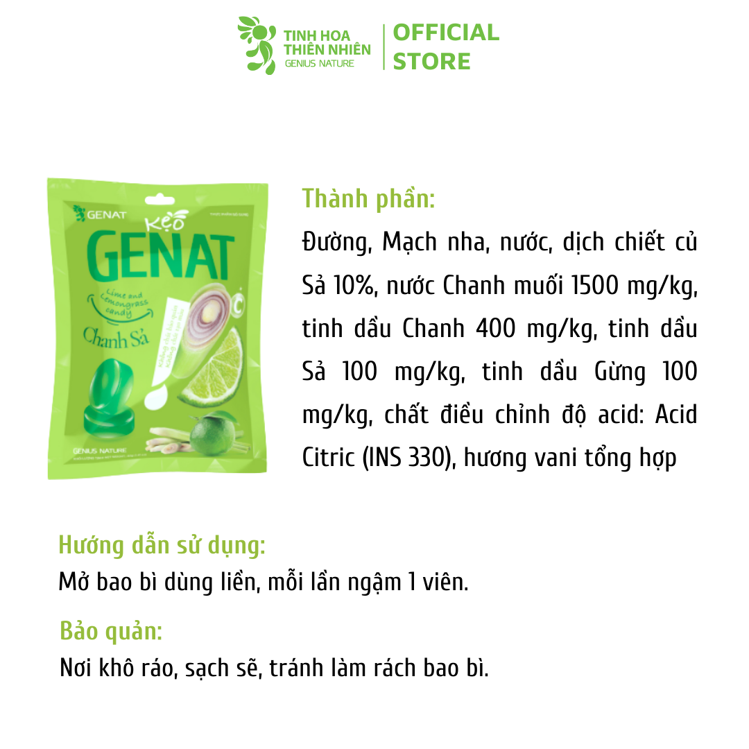 Kẹo ngậm Chanh Sả (Hủ 300 viên) - Genat -Tinh Hoa Thiên Nhiên Thành phần: Đường, Mạch nha, nước, dịch chiết củ Sả 10%, nước Chanh muối 1500 mg/kg, tinh dầu Chanh 400 mg/kg, tinh