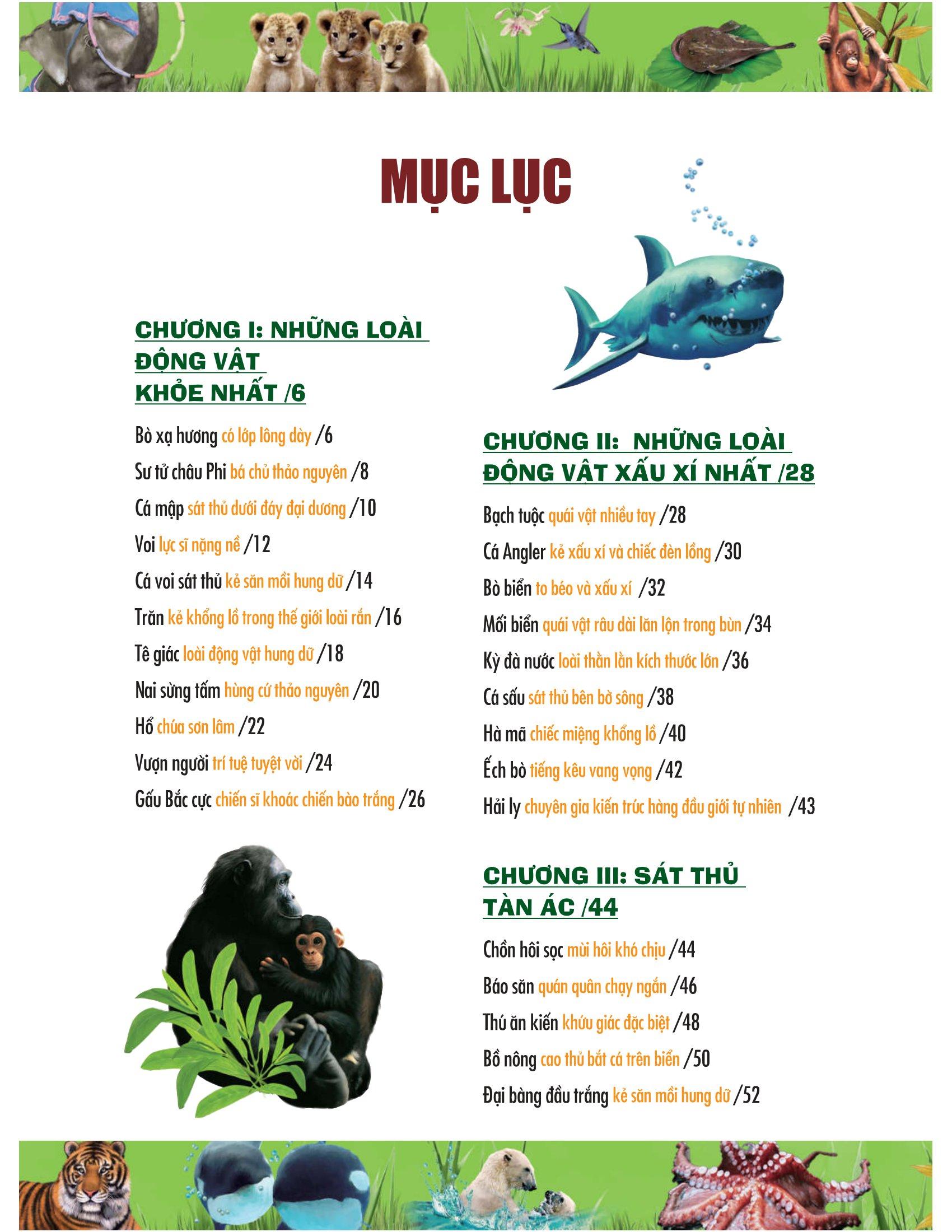 Cuốn sách này sử dụng những bức tranh sinh động và ngôn ngữ hài hước để giới thiệu với các bạn về đặc điểm inh hoạt, khả năng sinh tồn, những nét nổi bật của những loài động vật khỏe nhất, xấu xí nhất, tàn nhẫn nhất, nguy hiểm nhất, hung dữ nhất và kì diệu nhất… Cuốn sách sẽ cung cấp những kiến thức giúp chúng ta hiểu biết thêm về những loài động vậ