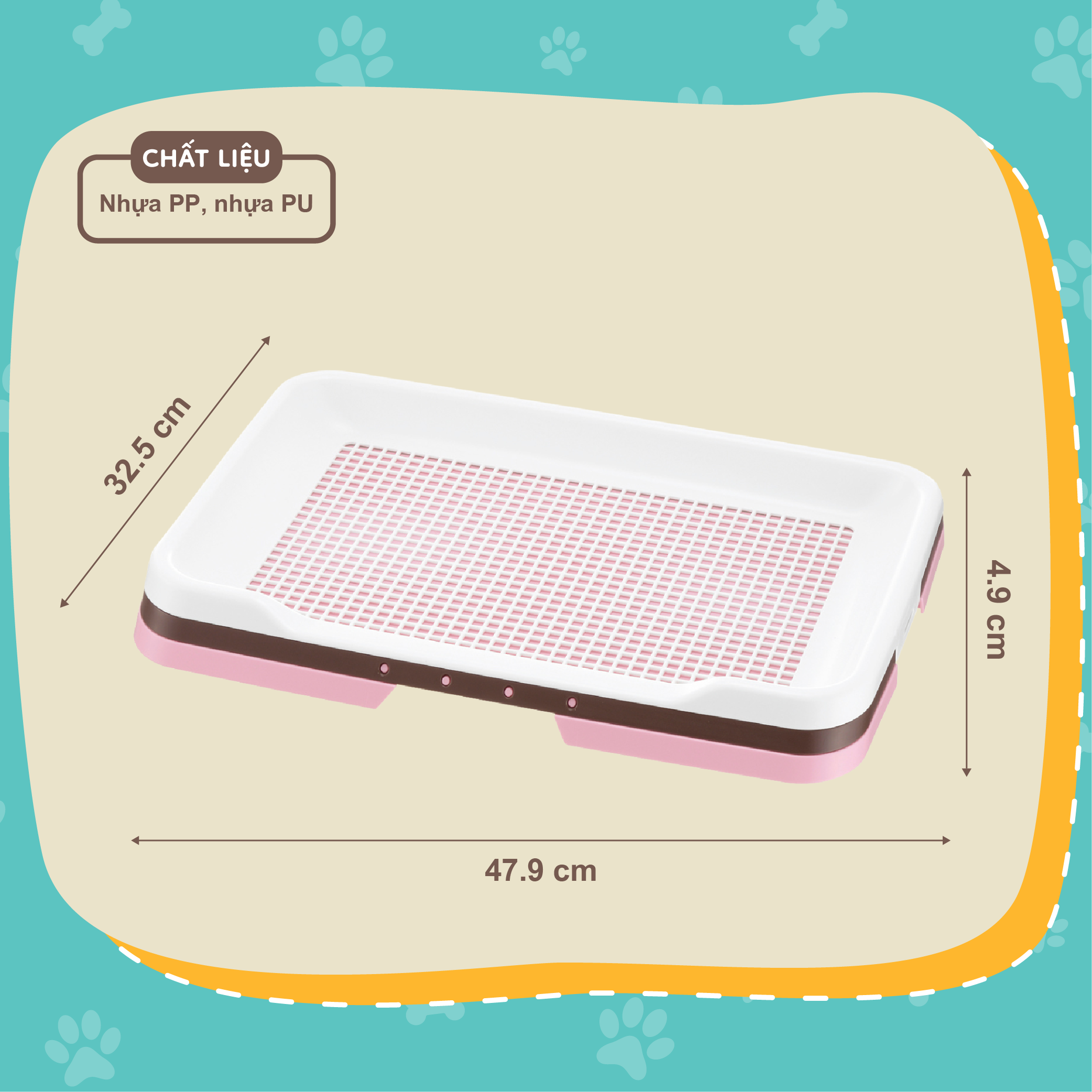 Thông số kỹ thuật sản phẩm:Kích thước: 47.9 x 32.5 x 4.9 cmChất liệu: Nhựa PP, nhựa PUMàu sắc: Nâu, Hồng, BeThiết kế bo tròn an toàn, dễ vệ sinhCó tấm lưới chắn giúp cố định miếng lótKhay đã có ...