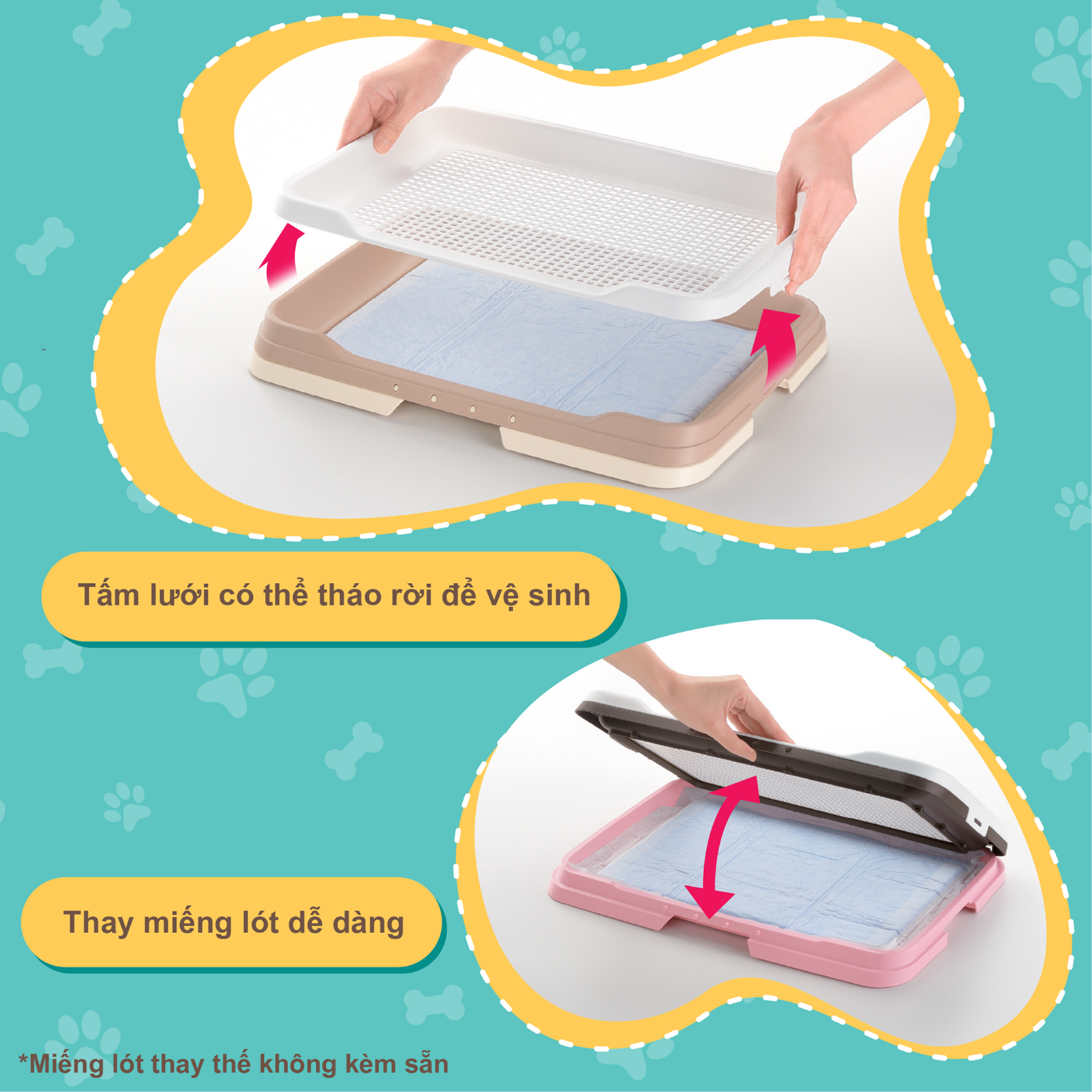 Tấm lưới trên khay có thể tháo rời linh hoạt, hỗ trợ việc vệ sinh khay nhanh chóng và tiện lợi. Đồng thời, việc thay miếng lót cũng cực kỳ đơn giản, chỉ cần mở khung và đặt tấm lót mới vào.