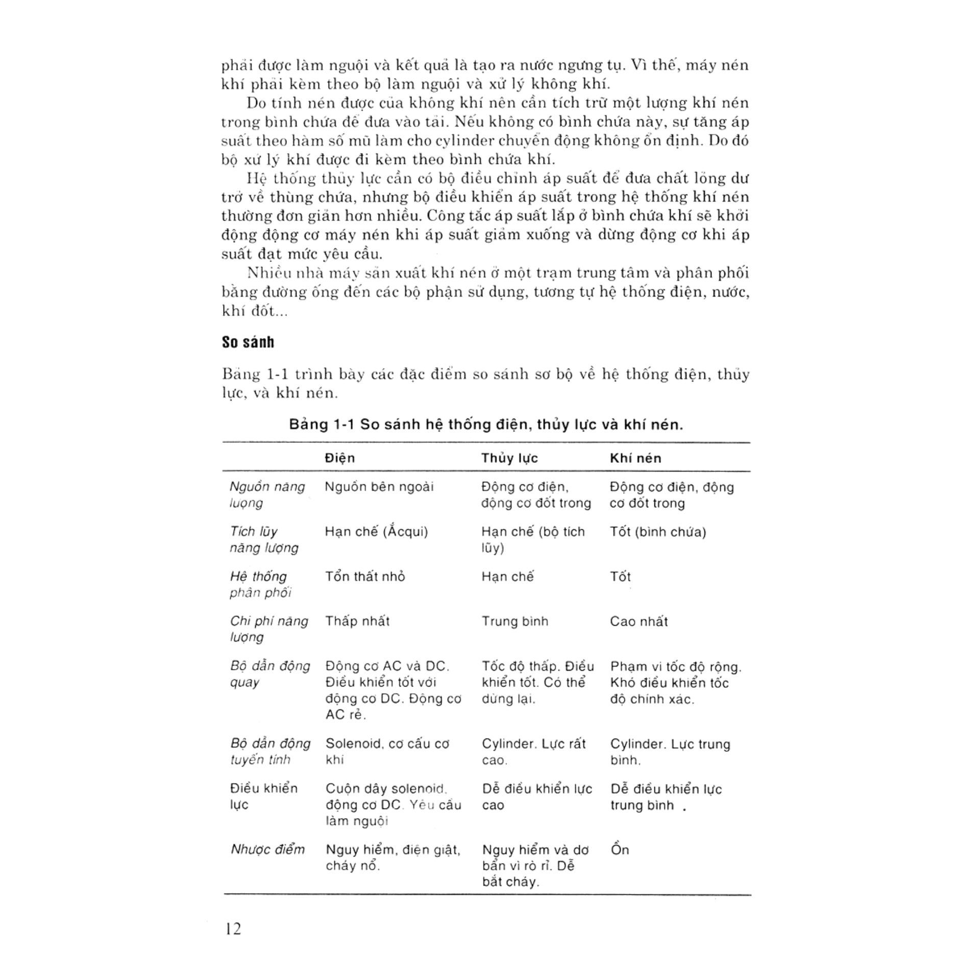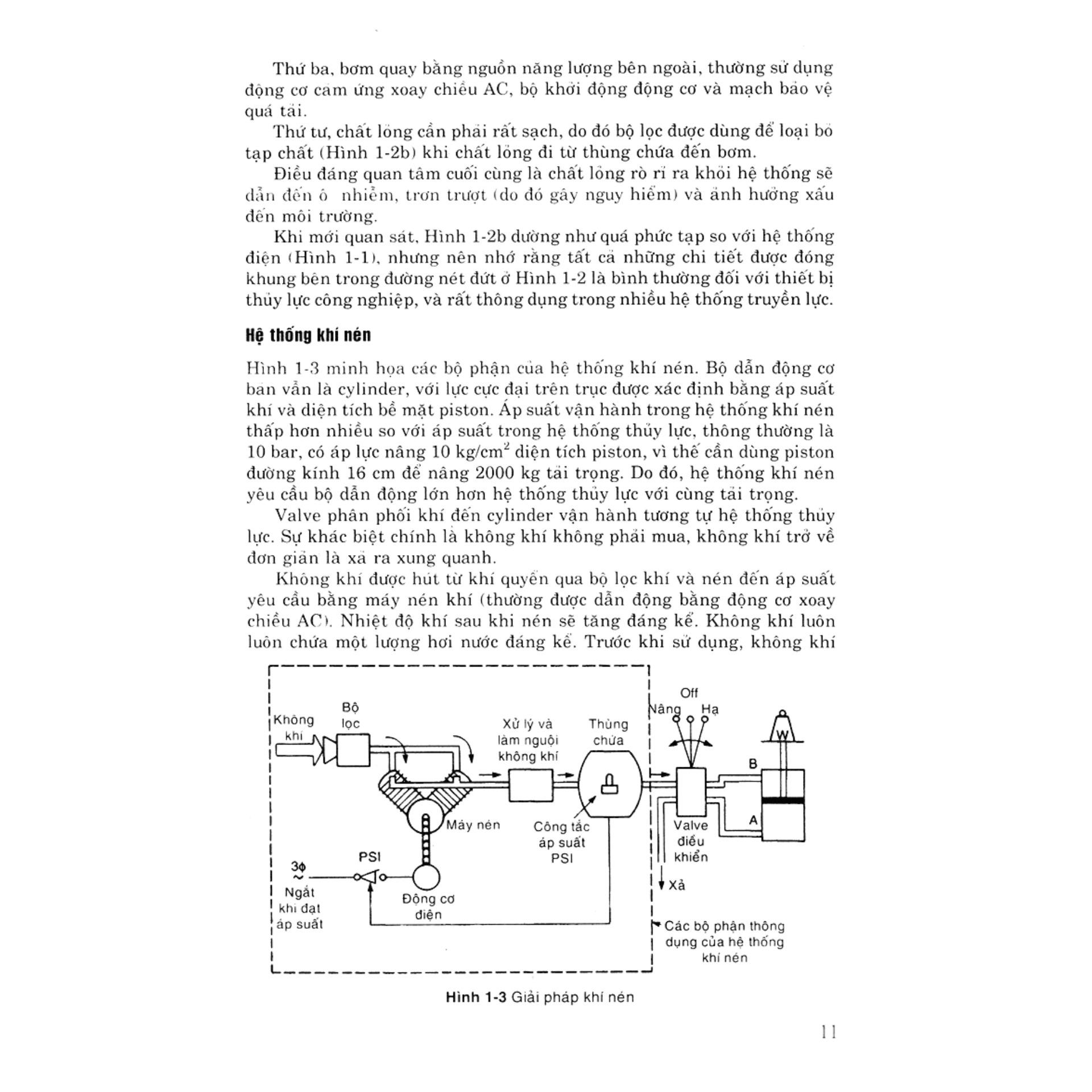 Chương 1. Nguyên lý cơ bản. Cơ cấu truyền năng lượng công nghiệp. So sánh các hệ thống truyền lực. Thuật ngữ kỹ thuật. Định luật pascal. Đo áp suất. Lưu lượng lưu chất. Nhiệt độ. định luật chất khí. Chương 2. Bơm thuỷ lực và điều chỉnh áp suất. Điều chỉnh áp suất. Các loại bơm . Valve tải. Bộ lọc Chương 3. Máy nén khí, xử lý không khí và điều chỉnh áp suất. Các loại máy nén. Bình chữa khí và điều khiển máy nén. Xử lý không khí. Điều chỉnh áp suất. Bộ phụ tùng. Chương 4. Valve điều khiển. Ký hiệu trên sơ đồ. Các loại valve điều khiển. Valve vận hành dẫn hướng. Valve điều khiển. Valve tịnh tiến đảo chiều và valve xả nhanh. Valve chuổi thứ tự. Valve tác động trễ. Valve cân bằng. Valve trợ động. Valve điều khiển module và bộ góp. Valve logic kiểu hộp. Chương 5. Bộ tác động. Bộ tác động tuyến tính. Vòng đệm kín. Bộ tác động quay.Ứng dụng. Bộ tác động kiểu hộp xếp. Chương 6. Các bộ phận trong hệ thuỷ lực và khí nén. Bình chứa thuỷ lực. Bộ tích luỹ thuỷ lực. Bộ trao đổi nhiệt và làm nguội thuỷ lực. Lưu chất thuỷ lực. Đường ống khí nén, ống mềm và khớp nối. Chương 7. Qúa trình điều khiển khí nén. Tín hiệu và tiêu chuẩn. Đầu phun kiểu cánh trập. Bộ tăng lưu lượng. Nguyên lý cân bằng lực và relay khí. Bộ điều khiển khí nén. Valve điều khiển quá trình và bộ tác động. Bộ chuyển đổi. Các ứng dụng chuổi thứ tự. Chương 8. An toàn, chẩn đoán sự cố và bảo dưỡng. Vệ sinh công nghiệp. Khí cụ chẩn đoán sự cố. Tìm sự cố. Bảo dưỡng phòng ngừa.