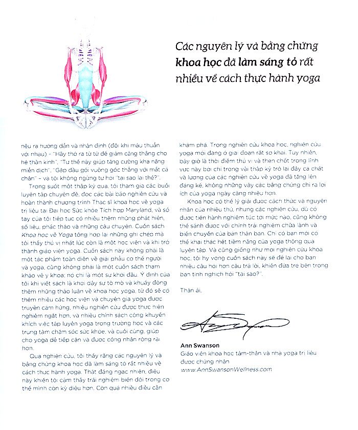 Lối sống hiện đại khiến con người dễ gặp stress và mắc các chứng bệnh thời công nghệ số như “cổ công nghệ”, “đau vai gáy”, “thoát vị đĩa đệm”… Khoa học đã chứng minh rằng yoga – các tư thế, các bài tập thở và thiền – không những giúp giải tỏa căng thẳng, giảm đau hiệu quả và chữa lành mà còn cải thiện các hệ cơ quan trong cơ thể. Với mong muốn đem đến cho mọi người cái nhìn toàn diện nhất, bao quát nhất về các giá trị thực tiễn của yoga, Khoa học về yoga đào sâu vào khía cạnh sinh lý học của hơn 30 tư thế yoga cốt lõi sau khi giới thiệu khái quát nhưng đầy thông tin về giải phẫu cơ thể. Mỗi tư thế được mô tả cặn kẽ và khoa học, từ mọi góc độ – cơ, xương, khớp – mang lại một hình dung cụ thể về cơ thể giúp các yogi tự tin thực hành và kiểm soát tốt tư thế, tránh gặp phải các chấn thương và tối ưu hóa hiệu quả của thực hành yoga.