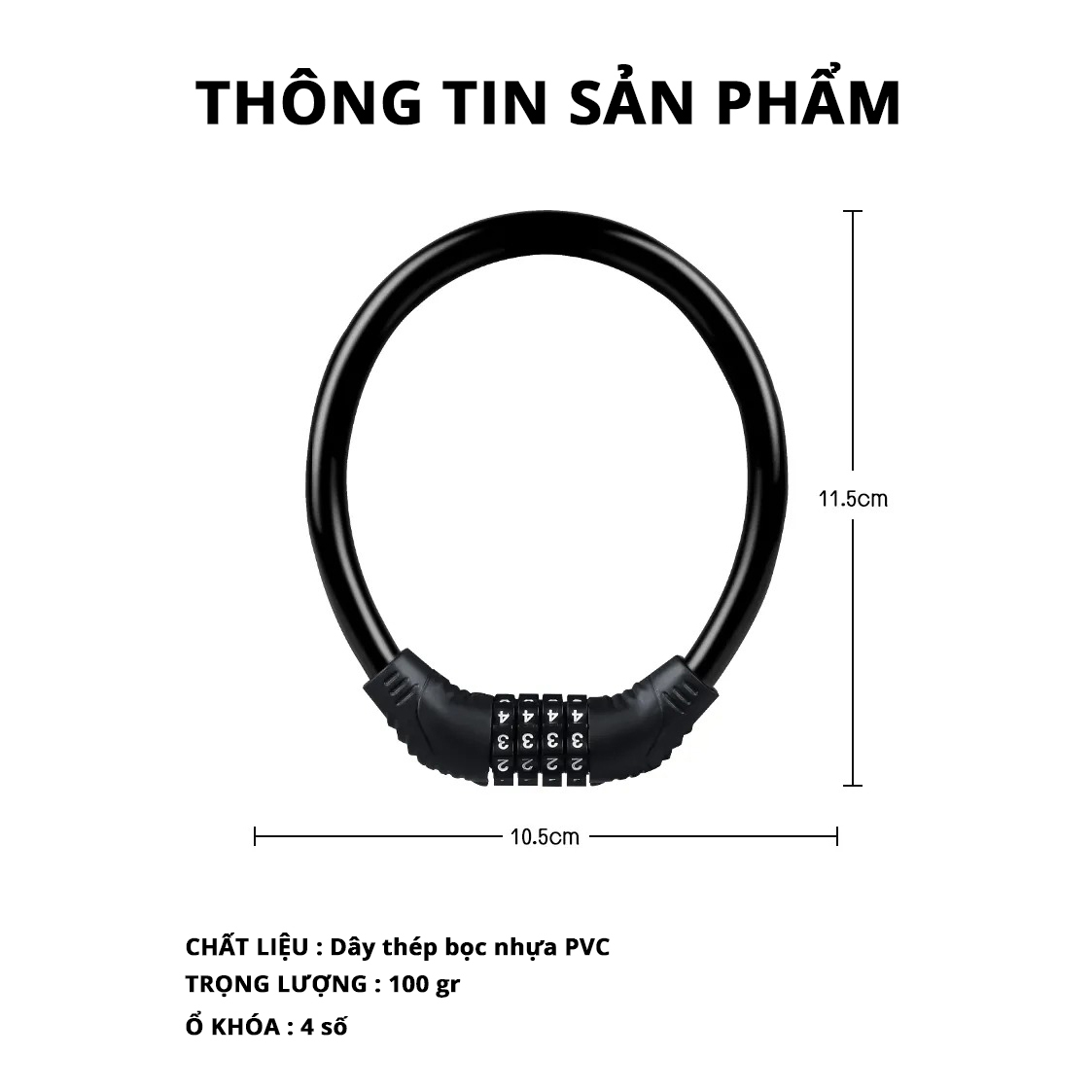 Dây cáp dài 1.8m, chất liệu thép cuộn bọc Vinyl MÀU ĐEN. Đường kính dây 8mm Gồm 02 chìa Ứng dụng khóa xe đạp