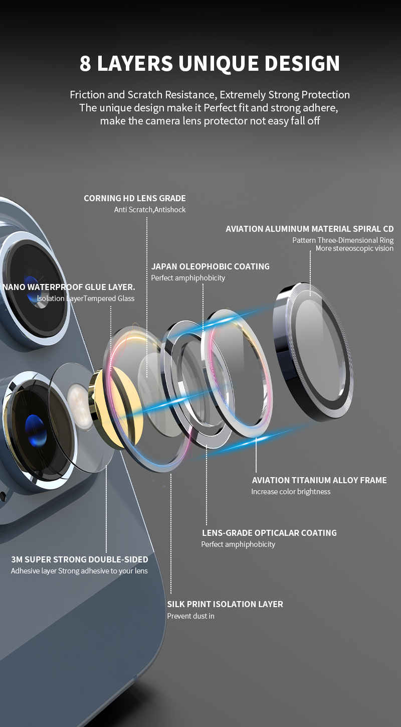 - Nano waterproof adhesive layer: Lớp keo chống thấm nano giúp lens hạn chế bám bụi bẩn, mồ hôi, chất dầu