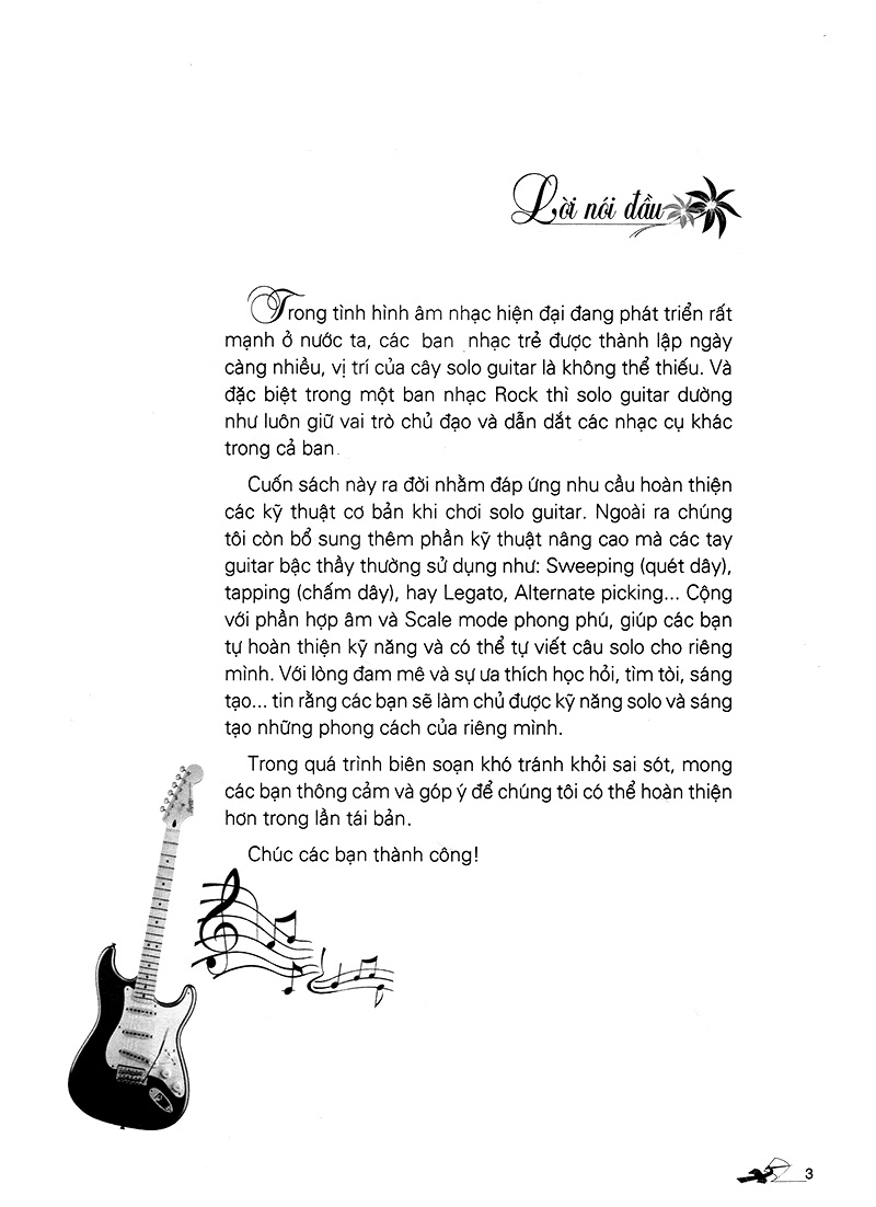 Cuốn sách Kỹ Thuật Solo Guitar ra đời nhằm đáp ứng nhu cầu hoàn thiện các kỹ thuật cơ bản khi chơi solo guitar. Ngoài ra sách cũng bổ sung thêm phần kỹ thuật nâng cao mà các tay guitar bậc thầy thường sử dụng như: Sweeping (quét dây), Tapping (chấm dây), hay Legato, Alternate Picking Cộng với phần hợp âm và scale mode phong phú, giúp các bạn tự hoàn thiện kỹ năng và có thể tự viết câu solo cho riêng mình.