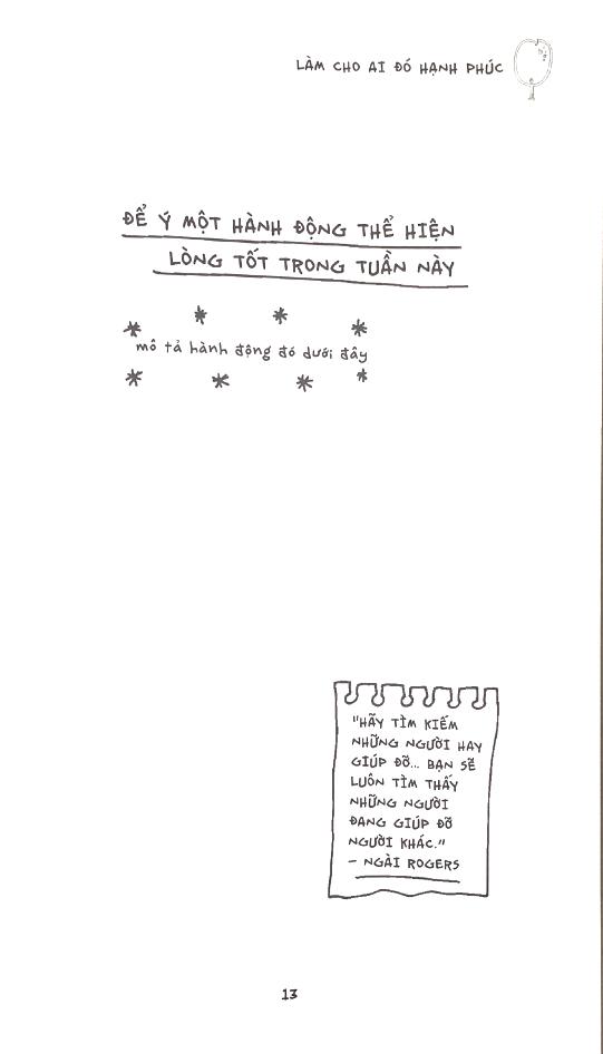 Làm Cho Ai Đó Hạnh Phúc - Make Someone Happy Cuốn sách này sẽ khiến bạn hạnh phúc. Trong một thế giới ảm đạm, người ta dễ bị mắc kẹt trong vòng xoáy tiêu cực. Hãy để cuốn sách tươi sáng, vui vẻ và đầy sáng tạo này xua tan mây mù trong cuộc sống của bạn: Tìm một tin tức tích cực trong tuần và dán vào trang sổ nhật ký của m.ình. Viết ra những điều khiến bạn mỉm cười hôm nay. Gửi đến bạn bè một “giỏ yêu thương” chứa đầy những lời nhắn vui tươi và món ăn vặt yêu thích của họ. Gây bất ngờ cho người lạ khi trả tiền cà phê cho họ. LÀM CHO AI ĐÓ HẠNH PHÚC nhắc bạn nhớ rằng những điều nhỏ nhặt tuyệt vời đang diễn ra mỗi ngày trong cuộc sống, và bạn cũng có khả năng lan truyền niềm vui đến những người xung quanh.