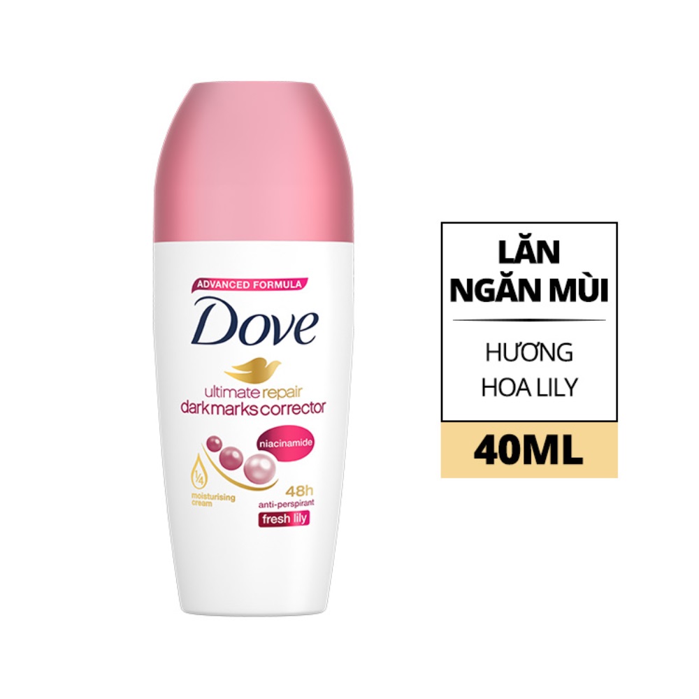- Lăn Khử Mùi Dove Ultimate Repair Antiperspirant Sáng Da Mờ Thâm Hương Fresh Lily 40ml chứa 1/4 kem dưỡng ẩm và Vitamin B3 không chỉ giúp khắc phục các vết thâm mà còn sửa chữa các tổn thương trên da, giúp phục hồi rõ rệt vùng da dưới cánh tay săn chắc, mịn màng.