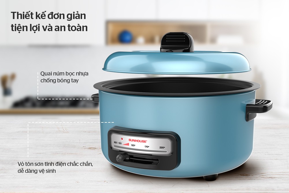 Thiết kế trang nhã, gọn nhẹ Nồi lẩu điện Sunhouse SH525 có thân nồi làm từ thép sơn tĩnh điện có khả năng chịu nhiệt cao và ít bị ảnh hưởng bởi môi trường. Màu sắc