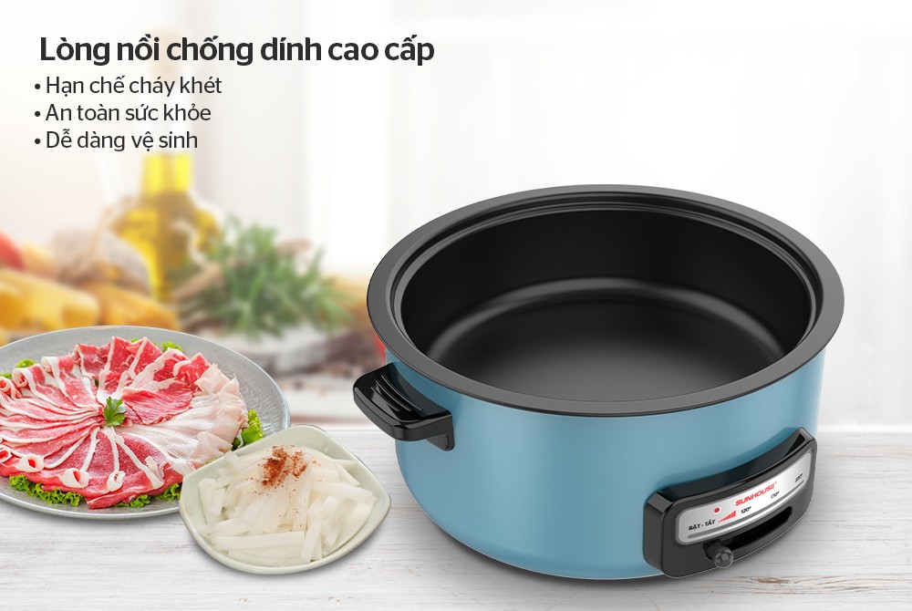 Lẩu điện Sunhouse SH525L - Hàng chính hãng *ĐẶC ĐIỂM NỔI BẬT Đa chức năng : Hầm, om, rán, xào, ninh… Nồi lẩu chống dính có thể tháo lắp dễ dàng Gạt điều chỉnh nhiệt
