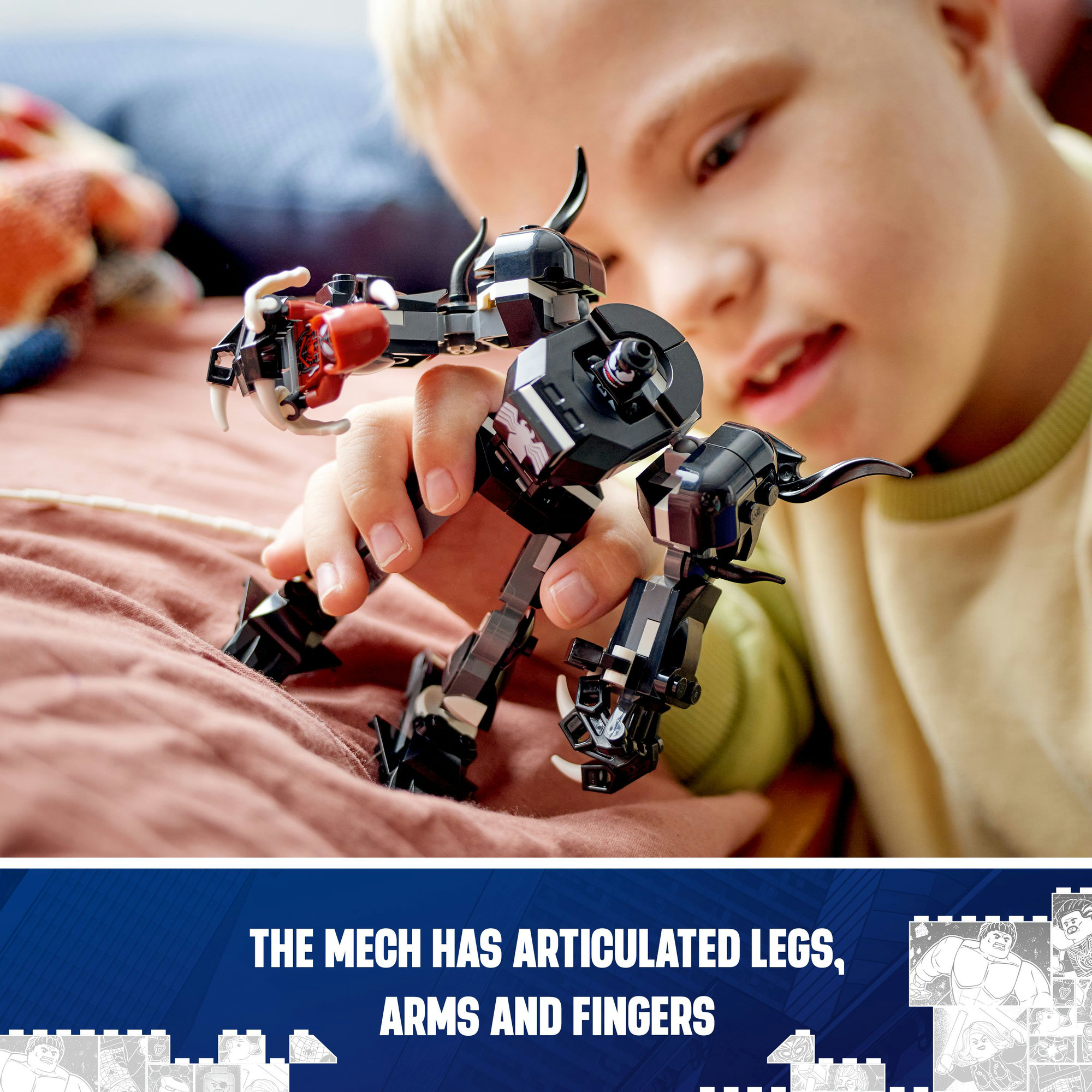 • Đồ chơi lắp ráp Chiến giáp Venom – Bao gồm một cỗ máy chiến giáp với chân, cánh tay và ngón tay có khớp nối, cùng với các mô hình Miles Morales và Venom LEGO