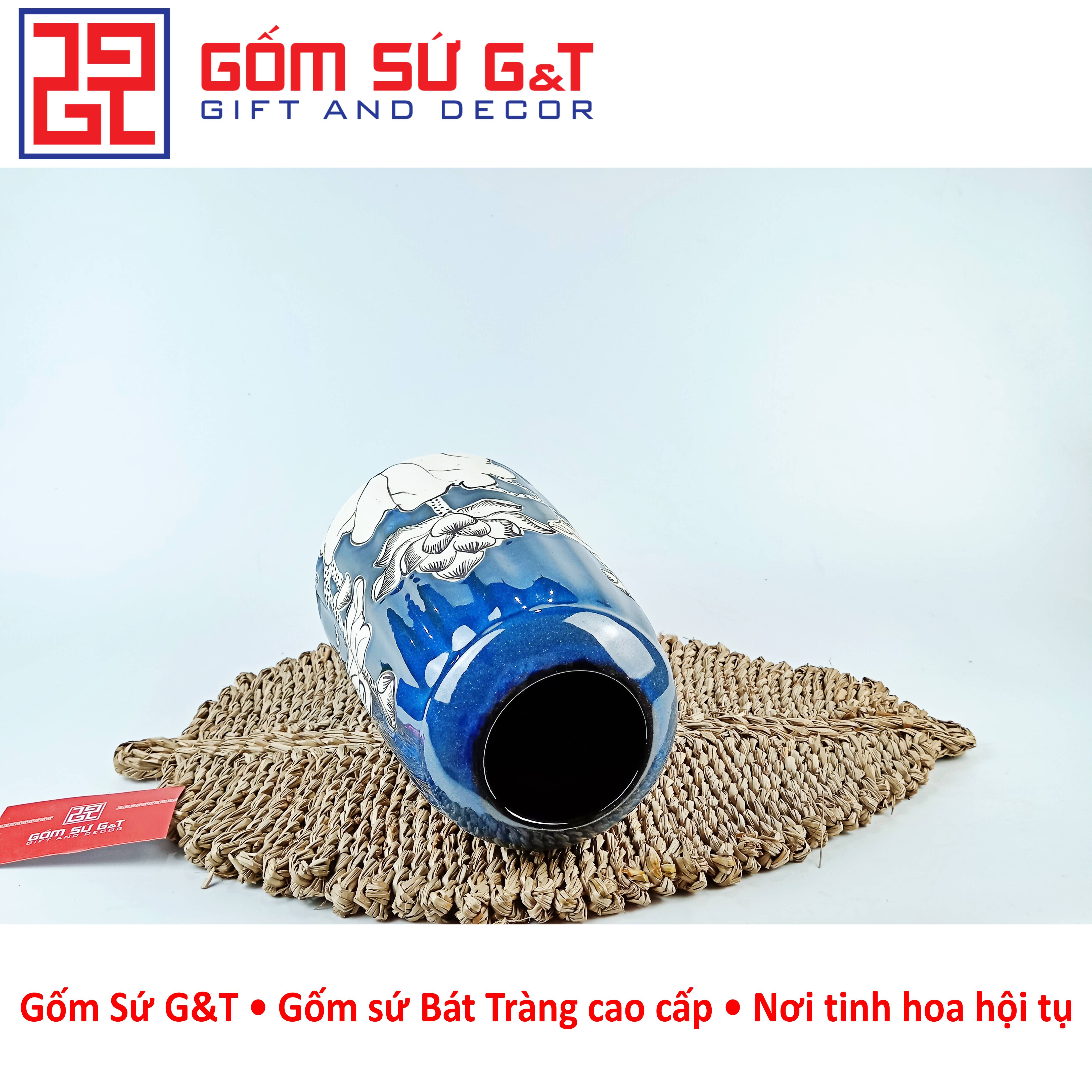 Bình hoa cao cấp Bát Tràng, hàng chuẩn loại 1, dáng chum họa tiết đắp nổi được thực hiện thủ công 100% bởi bàn tay lành nghề của các nghệ nhân làng nghề. Sản phẩm