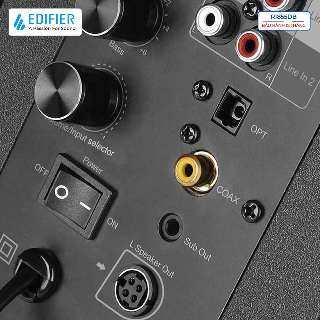 • Edifier R1855DB có đầy đủ tính năng điều khiển, kết nối cho bộ loa bookshelf. Điều chỉnh âm lượng, chuyển đổi đầu vào, tắt tiếng loa và tắt bật kết nối bluetooth. Loa không dây hỗ trợ cổng Line in cho kết nối máy tính, cổng optical hay còn gọi là cổng quang và coaxial cho kết nối chất lượng cao với TV. Đặc biệt, loa Edifier R1855DB hỗ trợ kết nối loa siêu trầm qua cổng subwoofer out, có thể kết nối với Edifier T5 tạo thành hệ thống 2.1 sống động với những bản nhạc mạnh như EDM, DJ.