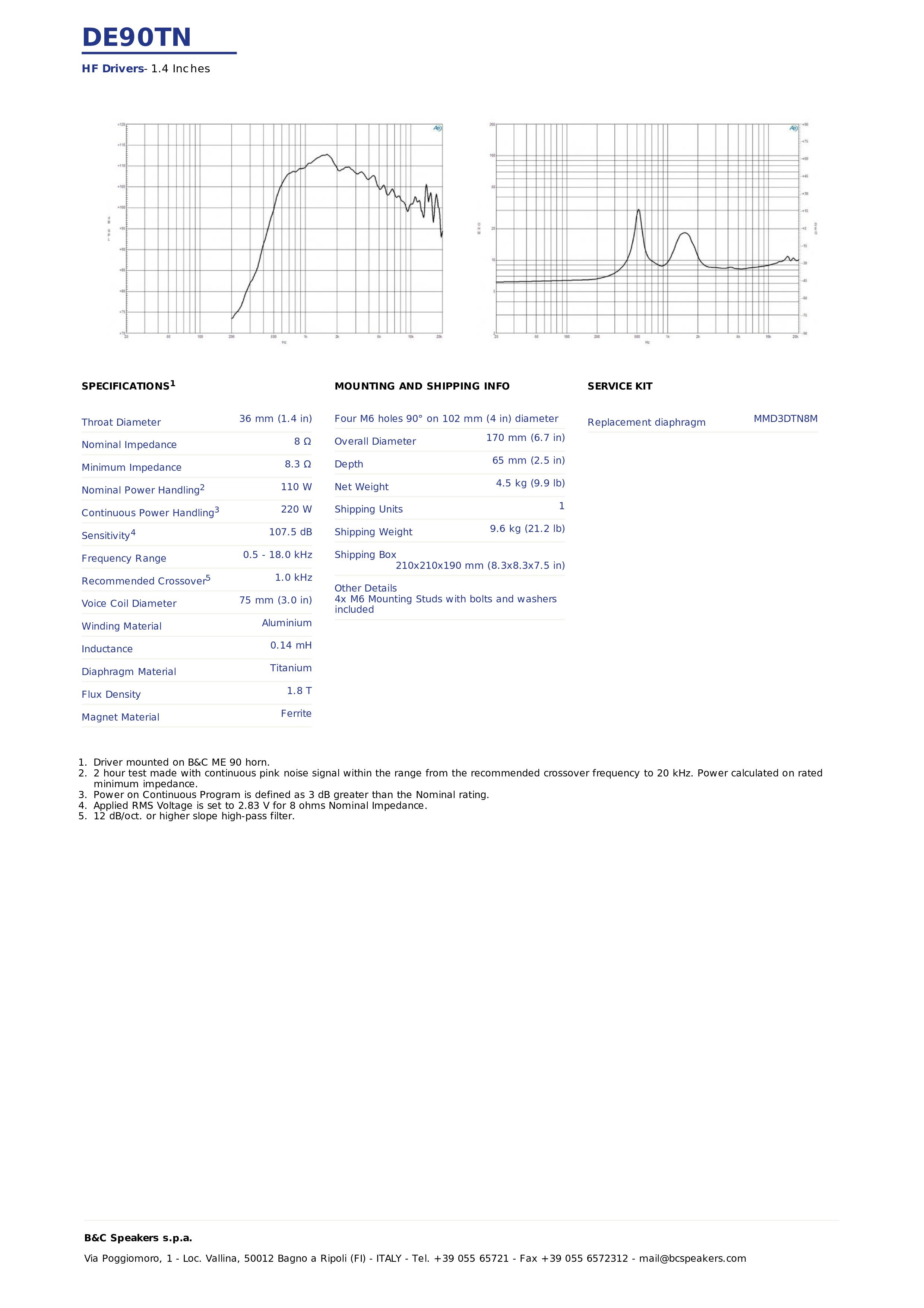 Loa Treble B&C SPEAKERS DE90TN Thương hiệu: B&C Xuất xứ: ITALIA Sử dụng họng 1.4" (ME90) Voice coil aluminium 75mm (3") Công Suất Program 220 W Độ nhạy: 107,5 db Dải tần: 500