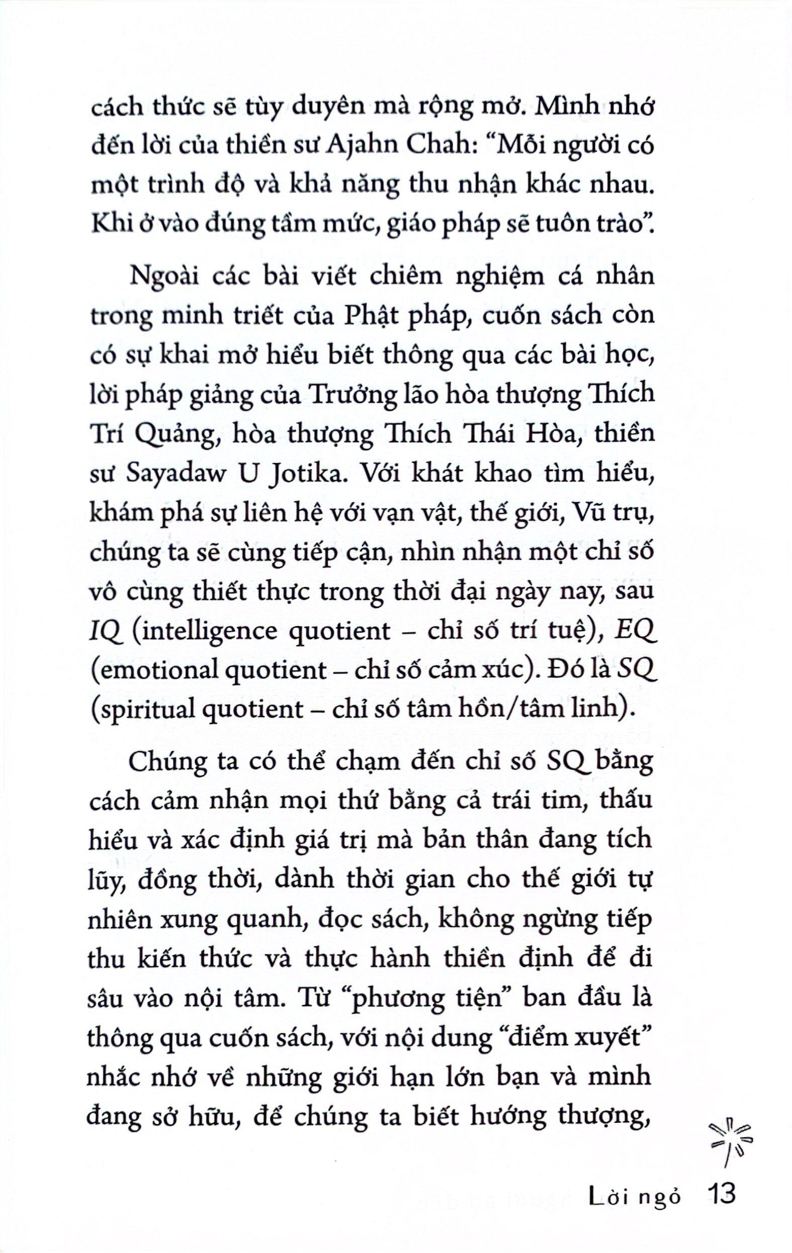 - Đúng hay sai, sau cùng đều là trưởng thành Trích dẫn sách: Trích đoạn 1: Làm người có chút “mẻ”, chút “sứt” mới hiểu được sự tròn khuyết của thế gian. Trầm m.ình tĩnh lặng trong gian khó, bĩ cực rồi mới có ngày thái lai. Khổ thì cũng khổ rồi, sợ khó khăn thì khó khăn cũng tới rồi. Nên những ai khi đó, trong suy nghĩ nhắc lòng phải tiến bước thì khúc ngoặt nào trong đời cũng sẽ “lội” qua được. Còn những ai bỏ cuộc chạy trốn, chắc chắn không thể vượt qua và nhìn thấy điều tốt đẹp phía sau khúc quanh đó. Qua cơn giông tố mới biết đâu là cây chắc rễ. Qua những lúc không bình lặng mới bật mạnh mẽ những tiềm năng vô tận. Trong mỗi người đều có “vật báu”, tùy bản lĩnh mà phát sáng lên dần. Trích đoạn 2: Mỗi người không chỉ có một mà có thể rất nhiều “trạm sạc” trong suốt cuộc đời, biểu hiện dưới nhiều phương pháp, phương tiện, cách thức khác nhau. Đôi khi cùng một “trạm” nhưng dòng cảm nhận, chuyển hóa năng lượng lại khác nhau tùy theo độ tuổi, chặng đường, sự thiếu đủ của mỗi người. Và điều hay nhất của những “trạm sạc” nằm ở việc, nó luôn lan tỏa năng lượng an lành một cách rất tự nhiên. Như những con người sống bình dị, yêu đời trong chính cách họ sống. Nó tự động truyền cảm hứng tốt đẹp đi muôn nơi mà không hề gượng ép hay khiên cưỡng. Biết đâu chính bạn lại đang là “trạm sạc” cho một người nào đó thông qua những điều bạn đang cống hiến tận tụy và dùng chính trái tim cảm nhận những nét đẹp của cuộc đời. Điều gì từ trái tim sẽ chạm đến trái tim! Chúng ta tương hỗ qua lại để động viên nhau như vậy cũng là đang nuôi dưỡng cho mầm thiện trong lòng. Khi tính thiện ngày càng lớn, ta sẽ có những quyết định sáng suốt, vì vậy, cuộc sống sẽ tốt hơn, phải không bạn? Trích đoạn 3: Nếu ta chết đi, trở về hư không, hóa hư vô, không có gì là của ta thì không đúng. Rõ ràng, trong cái không vẫn có cái của riêng ta như thế. Những giá trị vô hình: tỉnh thức, bình an, hạnh phúc tình ngườ giống như “sợi tơ vàng” để con người nương vào đó trở về lại nguồn cội. Dù ở tuổi đời nào, kiếp sống nào, hễ rời xa những điều trên, lập tức chúng ta lại cảm thấy lạc lõng, chới với. Nhưng có điều, dù chúng ta đến từ đâu, từ cảnh giới hay hành tinh nào ngoài Vũ trụ bao la, đã trải qua bao nhiêu kiếp sống đi chăng nữa, hễ đã có mặt ở Trái đất này, là đang cùng học và cùng trưởng thành, rất công bằng. Không vì có sứ mệnh, hay tiền kiếp lừng lẫy thế nào, từ thời không nào đến mà một người được ưu á Ai cũng phải trải qua bài học về “đoạn khổ, hướng sáng”. Trích đoạn 4: Tâm trạng và tính cách cũng được “dịch” sang ngôn ngữ cơ thể – cách đi đứng, ứng xử và giữ gìn bản thân nói lên rất nhiều về chúng ta là ai và chúng ta như thế nào. Tất cả đều thể hiện sinh động qua hình tướng bên ngoài. Khi một người giữ ý nghĩ sống không thẹn với lòng, với người, sống chính trực, dường như từ trên đầu, trong tim và lan ra khắp cơ thể sẽ có một nguồn sáng vô hình rất đẹp. Ngọn đèn từ nhân cách sống sẽ soi rọi cho gương mặt trở nên sáng sủa. Thần thái, khí chất rạng ngời. Người khác nhìn vào sẽ có cảm giác tin tưởng và tôn trọng. Mục lục Phần 1: Cho đời thêm nhẹ Mỉm cười ngay với phiên bản tệ nhất của bản thân Chúng ta của thời điểm này Điều kỳ diệu nơi sự xáo trộn Ai cũng có những câu chuyện riêng Tôi cần bạn Vâng, m.ình vẫn có đây! Ai cũng cần tình thương để lớn Cuộc đời luôn có những cách động viên âm thầm Đợi con tim biết vui trở lại Đi trong những ngày mưa Để nụ cười đừng tắt trong lòng “Điểm sáng” từ nghịch cảnh Thấy tổn thương nhưng đừng ở với tổn thương Hái sao trong lòng Để khi đi trốn có người đi tìm An dịu thân tâm với việc rèn dưỡng Ngừng để ổn, ngừng để đi tiếp Lâu lâu thả nguyện ước lên cao Chuyển hóa nỗi lo bằng việc rèn dưỡng Làm bạn với chính m.ình À, ngồi nghỉ cho khỏe! Hiểu người, người đến gần Cứ để điều tốt đẹp có mặt Hiểu rõ nhưng không cần làm rõ Thương, nhưng cứ để đó! Để năng lượng đẹp từ những điều chưa đẹp Mang năng lượng tích cực vào mọi quyết định Cho m.ình một quãng nghỉ Bước về nơi phù hợp Làm việc trong hạnh phúc Tươi cũng cầ tưới Tích cực cũng có cách riêng Có những ngày thấy vui đến lạ! Đâu cũng vào đấy! An là để cho người chưa an Mỗi người đều có riêng “trạm sạc” ấm lòng Phần 2: Cho duyên thêm lành Khi có rung cảm Người cần đến nhất định sẽ đến Thương trước, thương sau Có mặt trong từng bài học cuộc đời Nghe thấy hạnh phúc rồi sẽ hạnh phúc Nhẹ nhàng làm người tốt Lương tâm con người đều có những điều dễ thương “Bộ lọc” an lành Để những người cùng “tần số” là bạn lành Đến một n