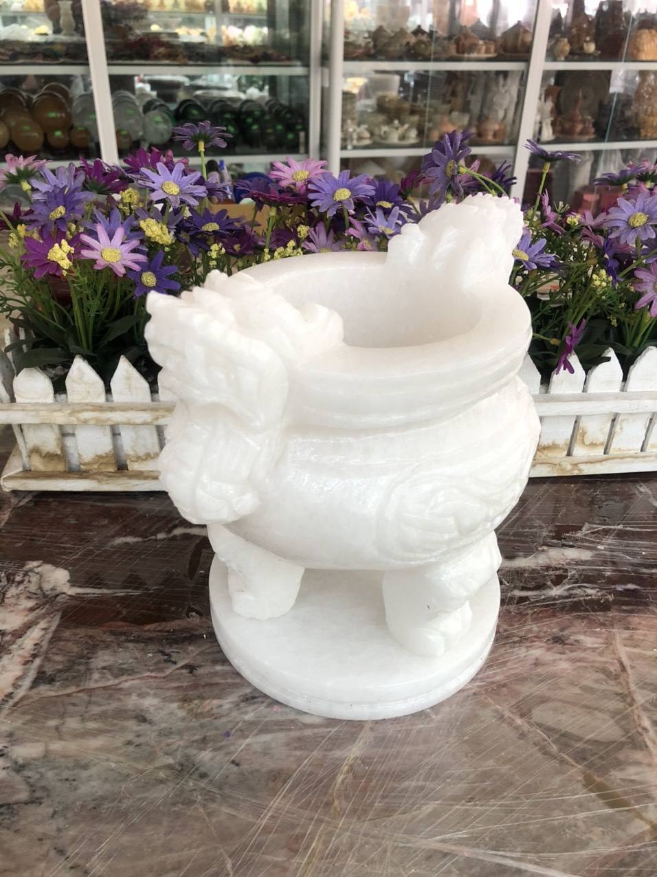 Kích thước: Cao 20cm; Đường kính miệng 13cm; Ngang 20cm Khối lượng: 5 kg Chất liệu: Đá cẩm thạch trắng