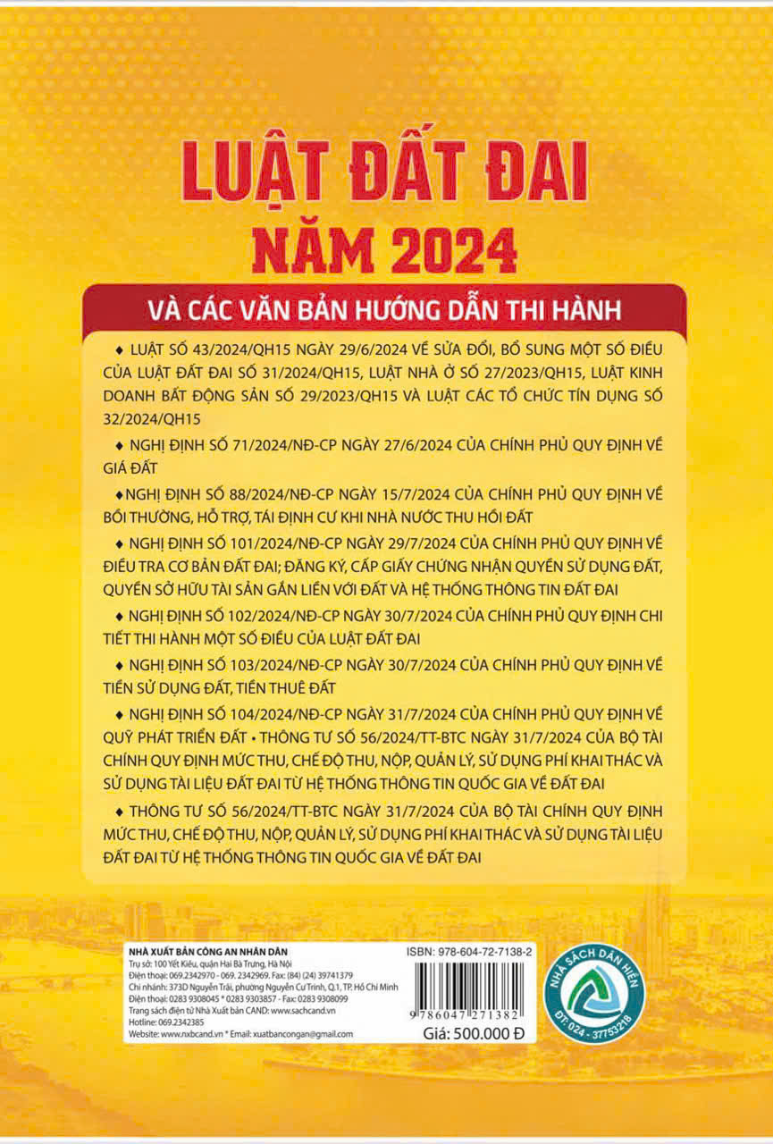 Luật đất đai năm 2024 và các văn bản hướng dẫn thi hành Tác giả: Quốc Hội Nhà xuất bản Công an nhân dân Công ty phát hành: Dân Hiền Xuất bản năm: 8.2024 Số