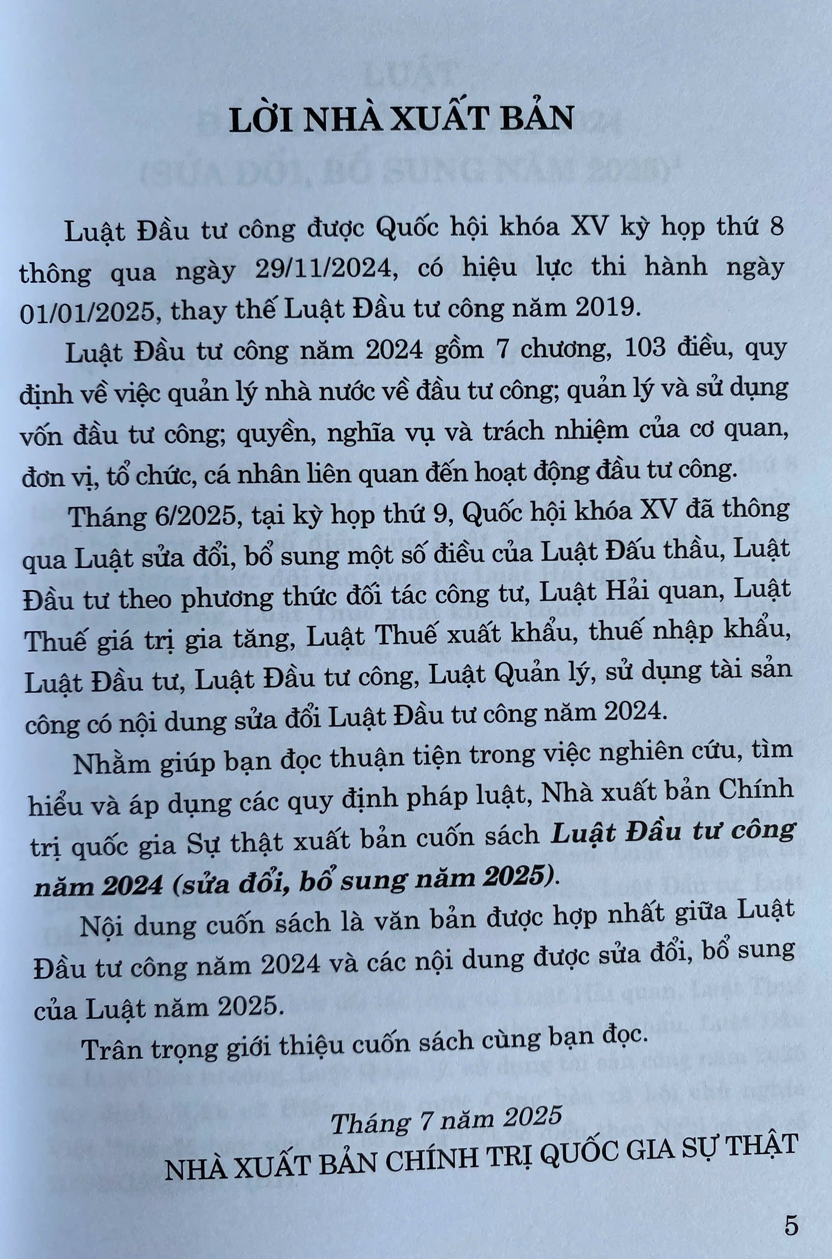 Luật Đầu tư công được Quốc hội khóa XV kỳ họp thứ 8 thông qua ngày 29/11/2024, có hiệu lực thi hành ngày 01/01/2025, thay thế Luật Đầu tư công năm 2019. Luật Đầu tư công năm 2024 gồm 7 chương, 103 điều, quy định về việc quản lý nhà nước về đầu tư công; quản lý và sử dụng vốn đầu tư công; quyền, nghĩa vụ và trách nhiệm của cơ quan, đơn vị, tổ chức, cá nhân liên quan đến hoạt động đầu tư công. Tháng 6/2025, tại kỳ họp thứ 9, Quốc hội khóa XV đã thông qua Luật sửa đổi, bổ sung một số điều của Luật Đấu thầu, Luật Đầu tư theo phương thức đối tác công tư, Luật Hải quan, Luật Thuế giá trị gia tăng, Luật Thuế xuất khẩu, thuế nhập khẩu, Luật Đầu tư, Luật Đầu tư công, Luật Quản lý, sử dụng tài sản công có nội dung sửa đổi Luật Đầu tư công năm 2024. Nhằm giúp bạn đọc thuận tiện trong việc nghiên cứu, tìm hiểu và áp dụng các quy định pháp luật, Nhà xuất bản Chính trị quốc gia Sự thật xuất bản cuốn sách Luật Đầu tư công năm 2024 (sửa đổi, bổ sung năm 2025). Nội dung cuốn sách là văn bản được hợp nhất giữa Luật Đầu tư công năm 2024 và các nội dung được sửa đổi, bổ sung của Luật năm 2025. Trân trọng giới thiệu cuốn sách cùng bạn đọc.
