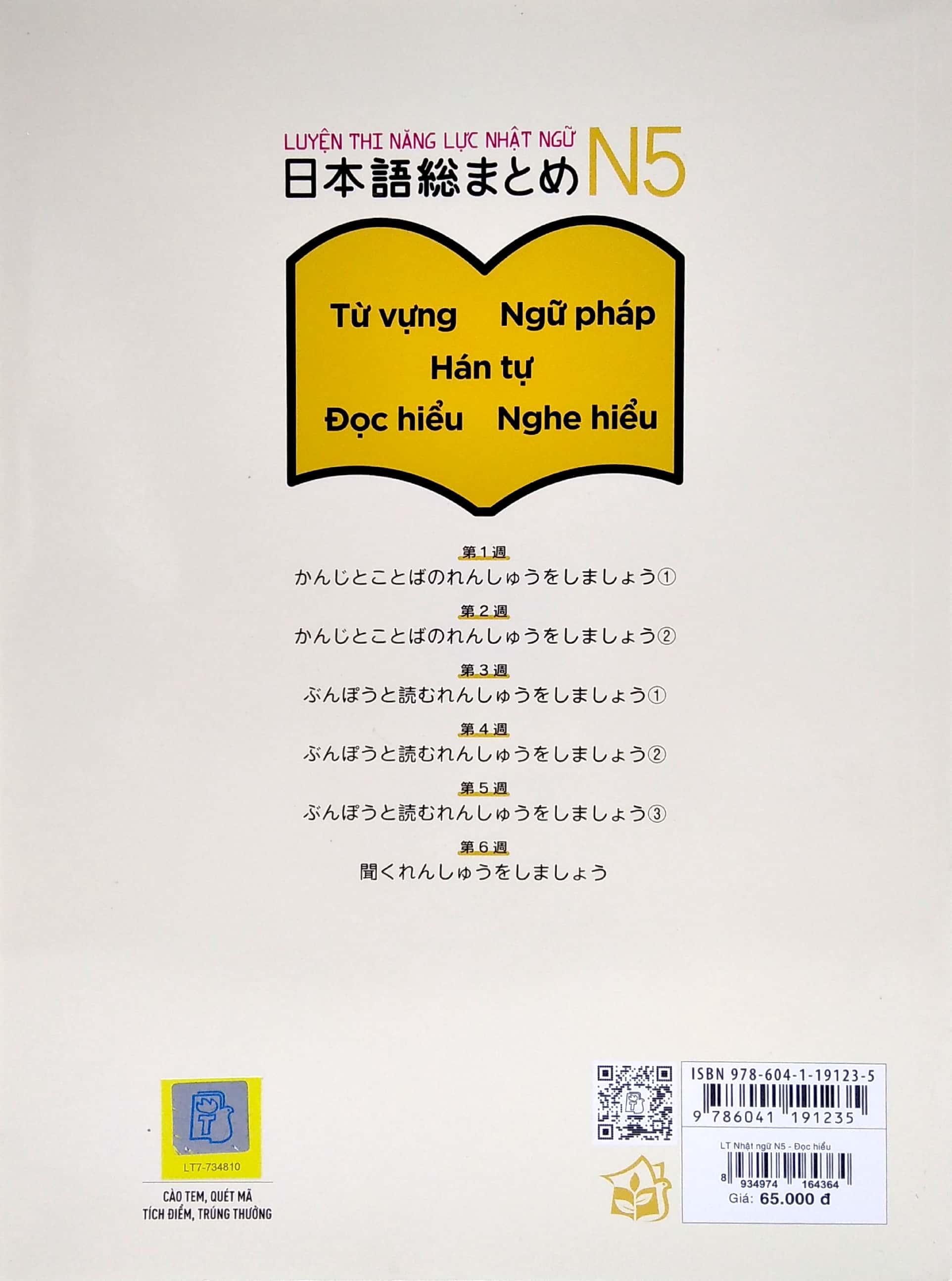 Mua tại TiktokBộ sách gồm 1 quyển: "Hán tự (Kanji) - Từ vựng (Goi) - Đọc hiểu (Dokkai) - Nghe hiểu (Choukai) - Ngữ pháp (Bunpou)