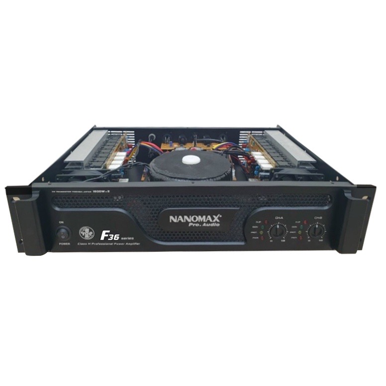 Mua tại TiktokMain công suất Nanomax F36 Thông số kỹ thuật: Dãy tần hoạt động: 20Hz - 20KHz Mạch công suất: Class H (Chức năng bù nguồn) Sò công suất: 36 sò ToshibaJapan Công suất: