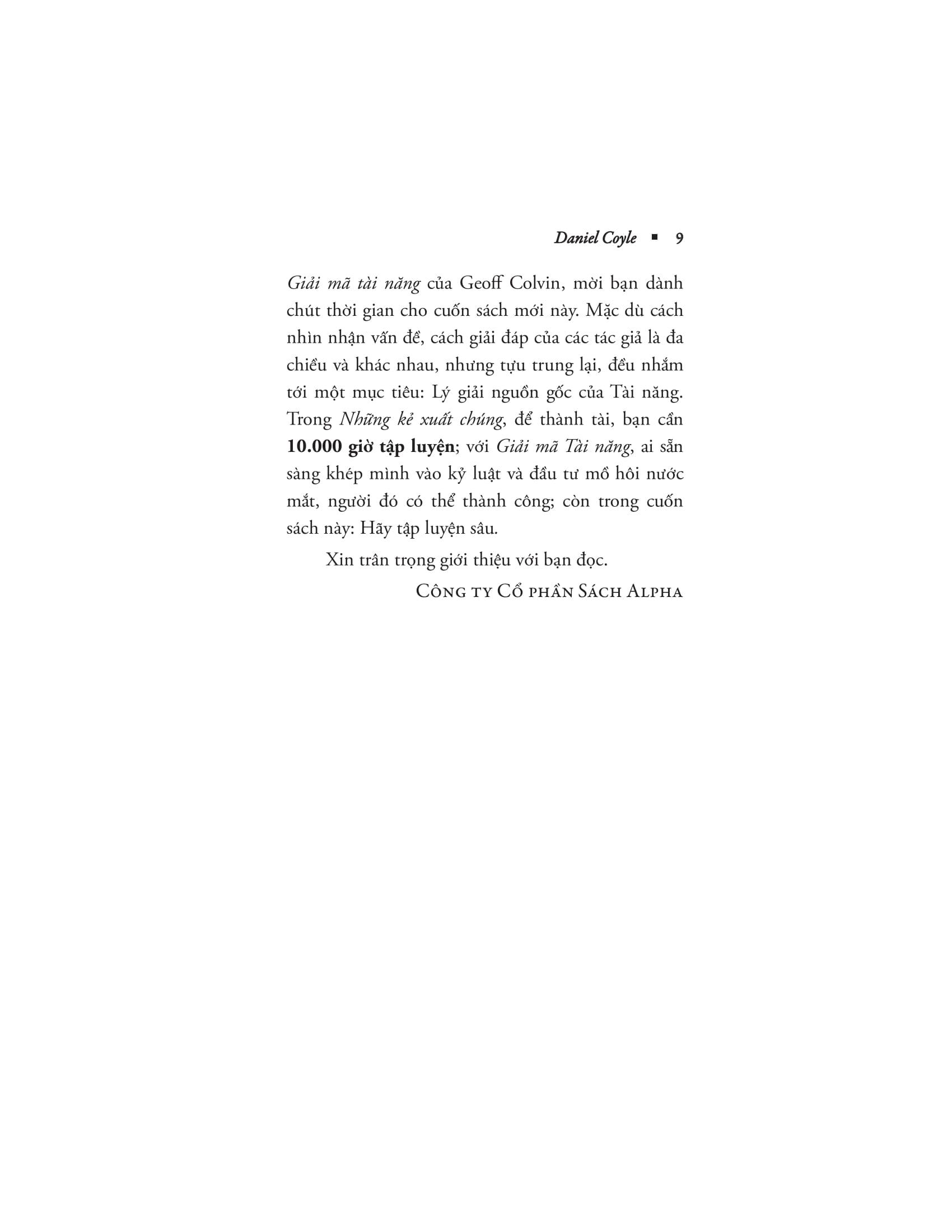 Dù bạn đang huấn luyện cho một đội bòng bầu dục hay dạy một đứa trẻ chơi đàn piano, viết tiểu thuyết hay cố gắng cải thiện cú vung gậy trong môn bóng chày thì cuốn sách mang tính cách mạng này sẽ chỉ cho bạn biết cách nuôi dưỡng và phát triển tài năng thông qua việc khai thác và sử dụng một cơ chế mới được khám phá của não bộ.
