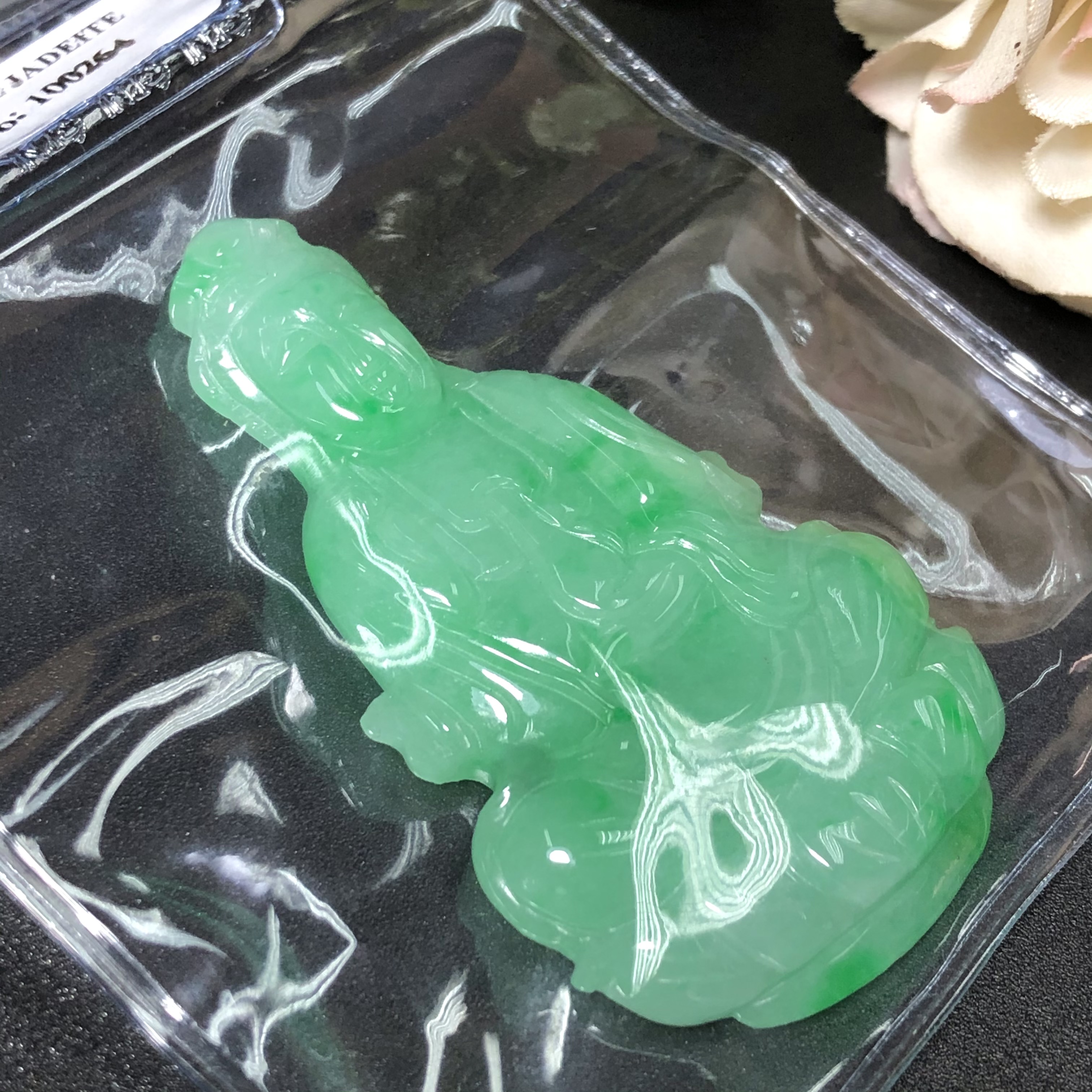 Mặt Phật Bà Cẩm Thạch xanh lí nhạt dáng ngồi cao cấp - Chất liệu: Ngọc Cẩm Thạch tự nhiên. - Màu sắc: xanh đậm phớt trắng - Kích thước: ngang mm, cao mm, dày mmxmm - Mã kiểm định: - Tiêu
